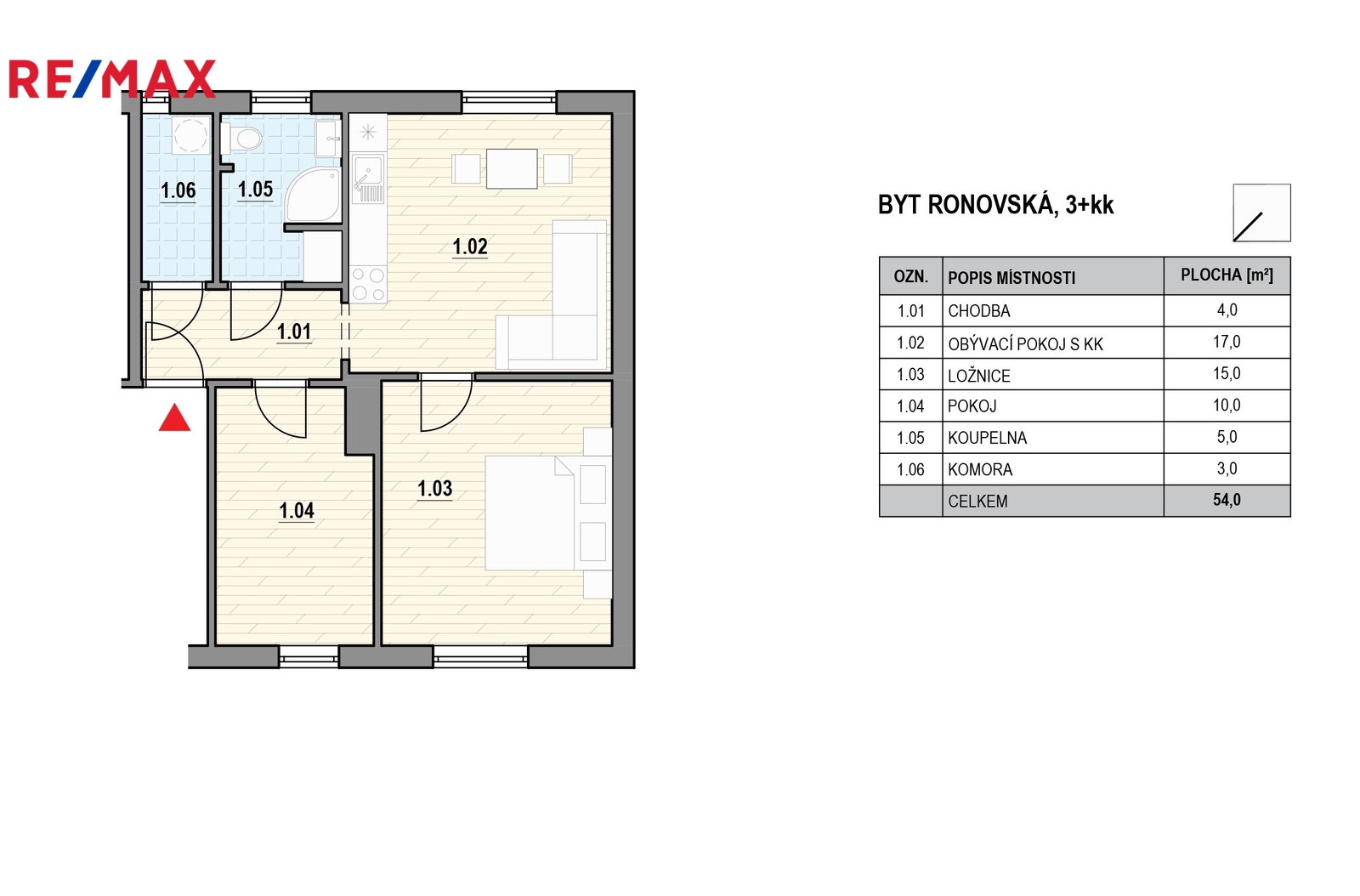 Podlahová plocha bytu je 53 m², pokoje: 17 m² (kuchyňská linka), 15 a 10 m², chodba 4 m². Předchozí majitel byt v r.2018 rekonstruoval: v koupelně (5 m²) je sprchový kout, nové WC, kuchyňská linka na míru s vestavěnými spotřebiči. Ve většině bytu jsou vinylové podlahy, v koupelně a v komoře dlažba, plastová okna, k dispozici velký sklep v suterénu. 2 okna směřují do ulice (směr severozápad), okno z obývacího pokoje je orientováno na jihovýchod (příjemné vnitřní klima po celý rok). Byt nemá balkon.