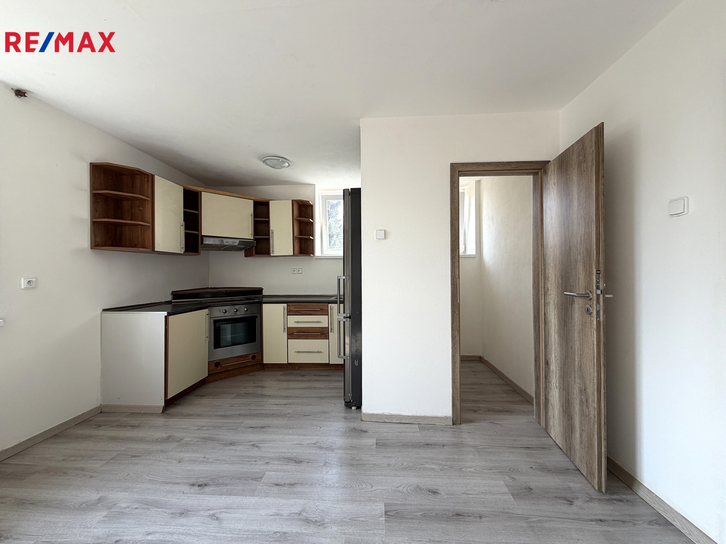 V bytě je instalována starší funkční kuchyňská linka s vestavěnou troubou, elektrickou varnou deskou a digestoří.