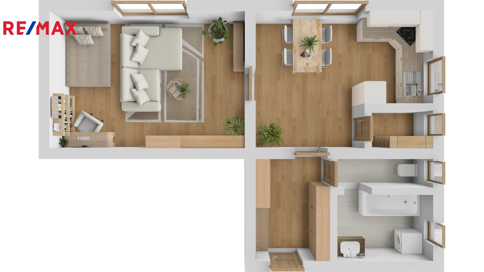 Byt je orientován na jihovýchod, má standardní velikost oken a to zaručuje i přes umístění ve sníženém přízemí dostatek denního světla.
