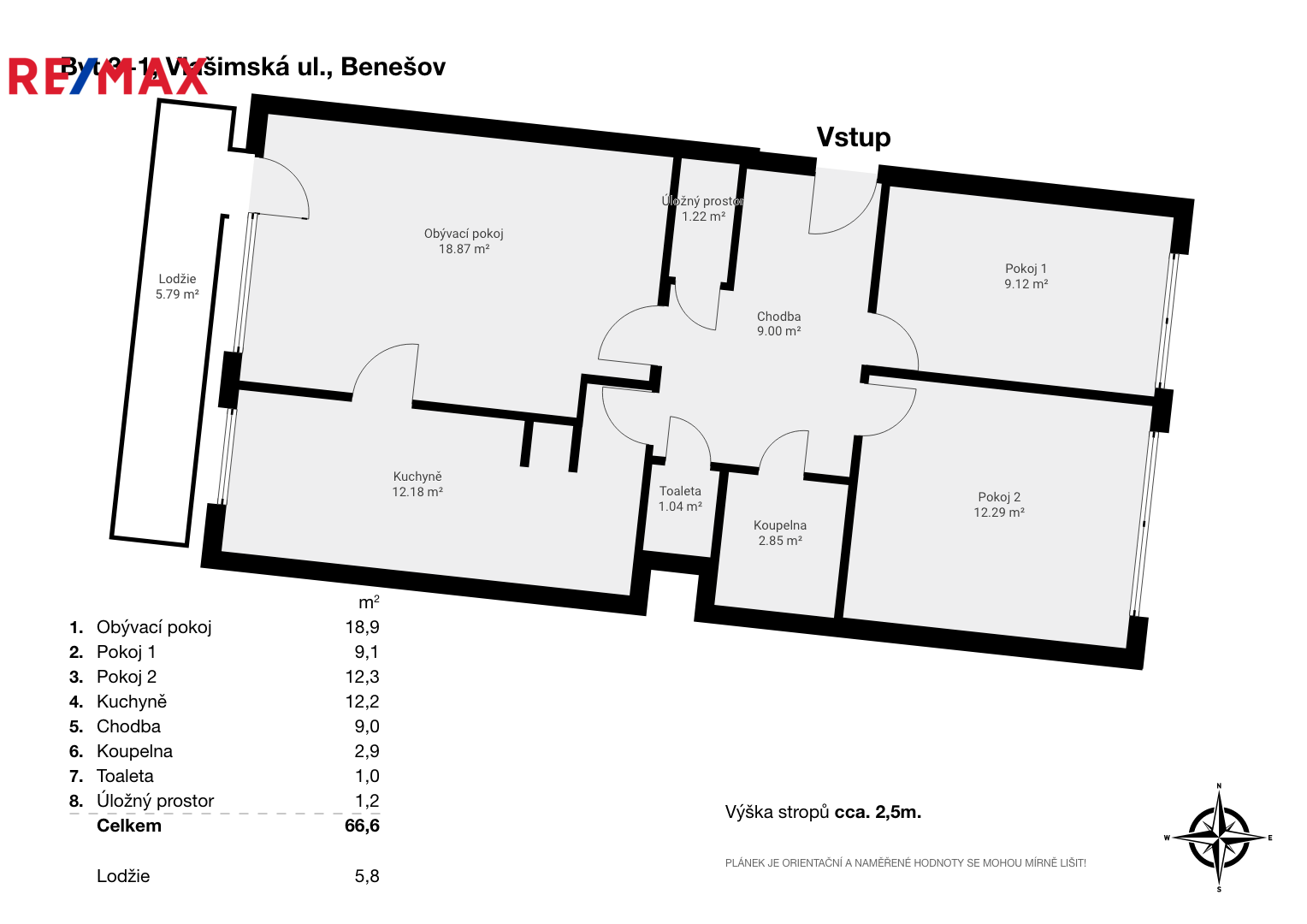 Nabízíme k prodeji byt o dispozici 3+1 v osobním vlastnictví o podlahové ploše 66,6 m² s lodžií 5,8 m² a sklepem 1,8 m², situovaný v 1. nadzemním podlaží domu v ulici Vlašimská 1793 v Benešově u Prahy.