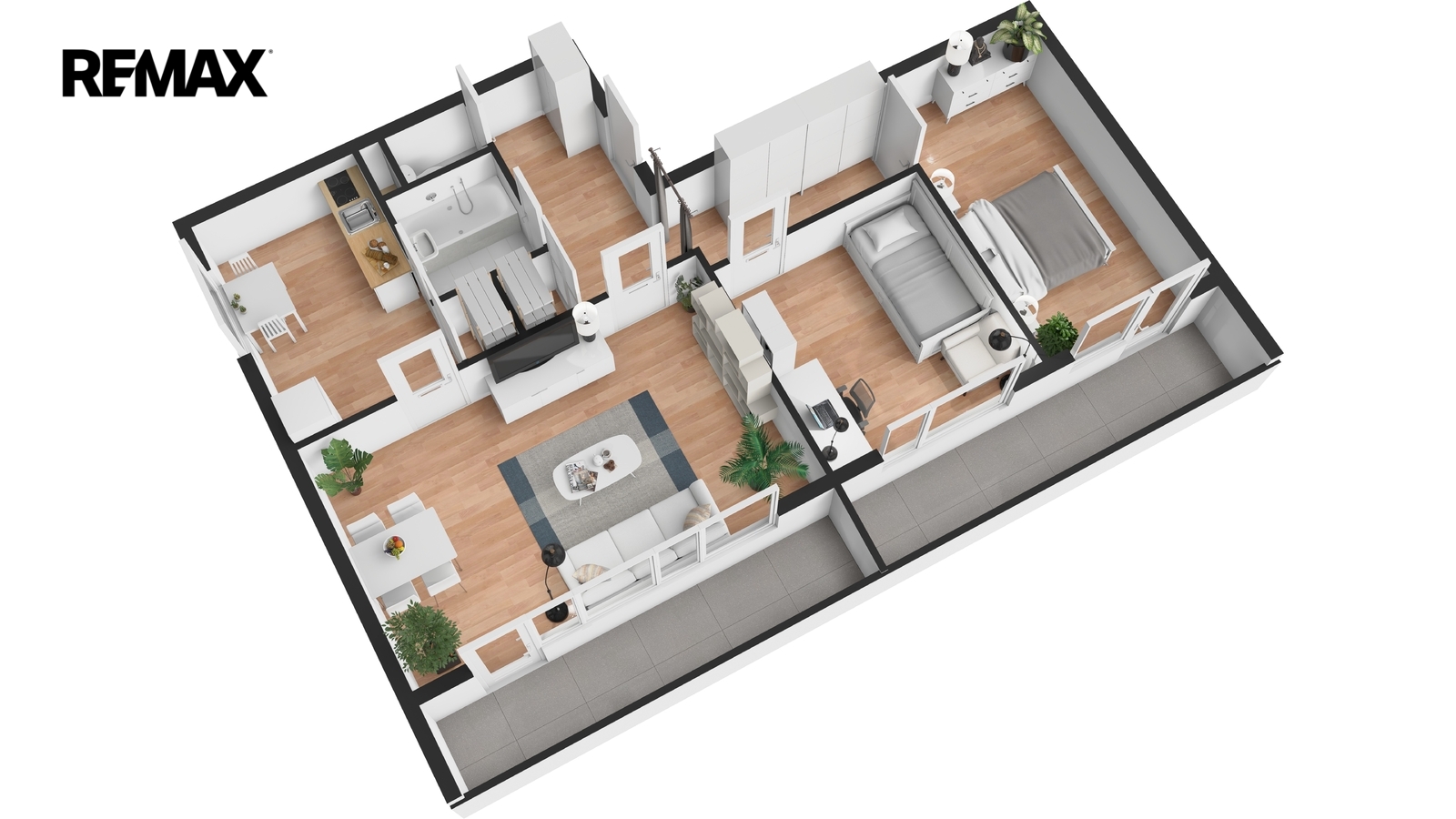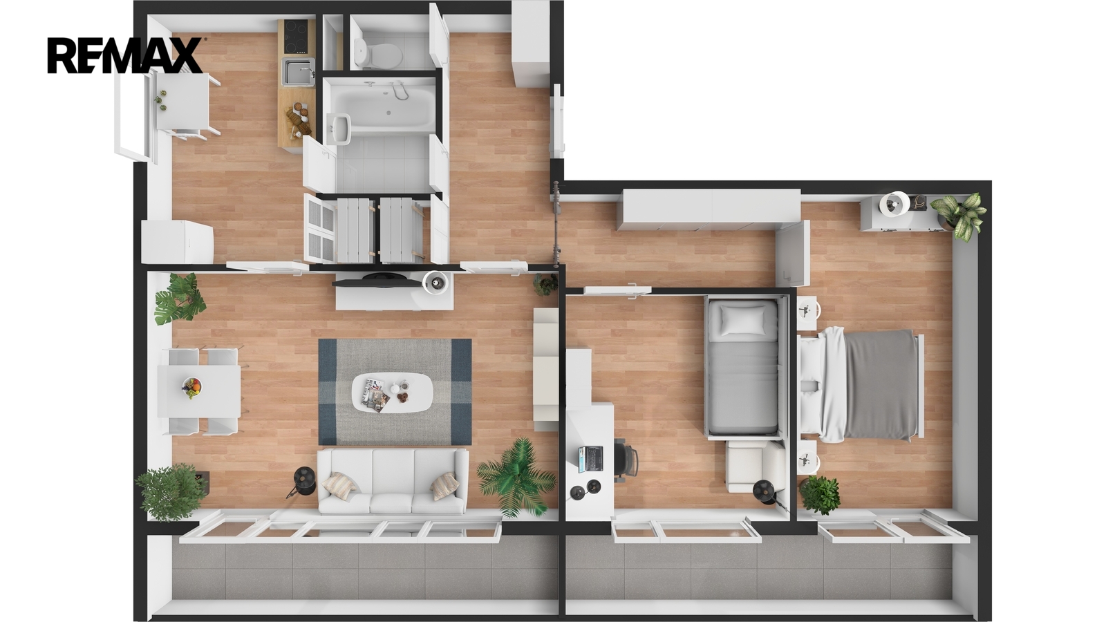 K bytu náleží dvě zasklené lodžie o celkové ploše téměř 14 m² se západní orientací, přičemž jedna je přístupná z obývacího pokoje a druhá z ložnice. Lodžie poskytují příjemný venkovní prostor s výhledem do okolí a díky zasklení je lze využívat po většinu roku jako příjemnou relaxační zónu.