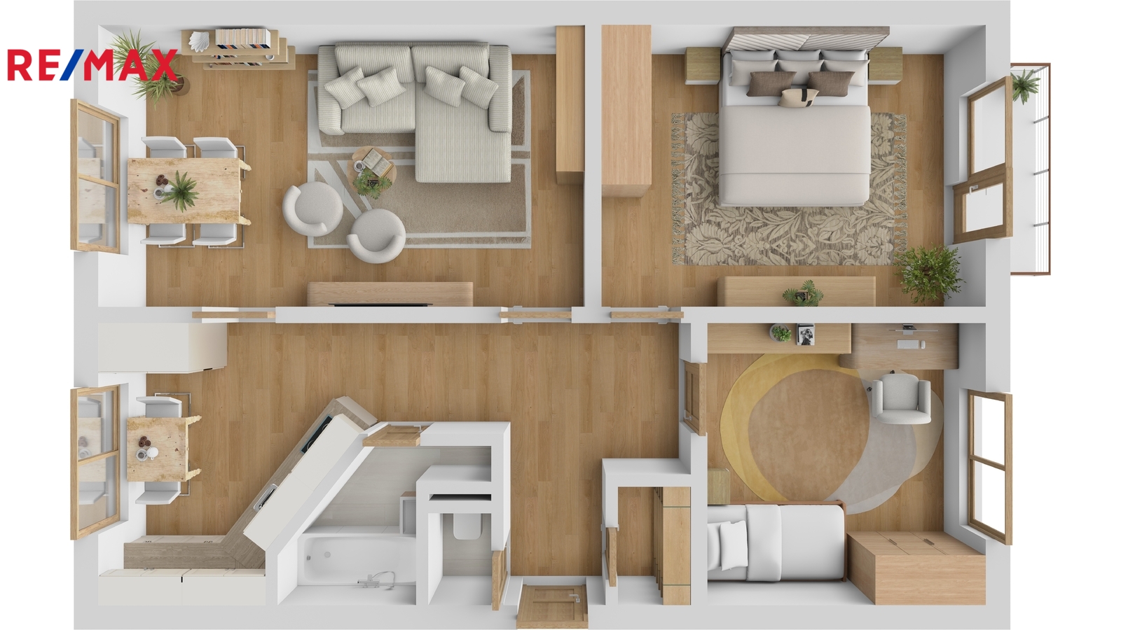 Dispozice bytu je velmi praktická. Po vstupu Vás přivítá prostorná chodba s komorou, která poskytuje dostatek úložného prostoru. Dále je zde samostatná toaleta, koupelna s vanou a kuchyně navazující na prostorný obývací pokoj. Byt disponuje dvěma neprůchozími ložnicemi, z nichž jedna má vstup na balkon.