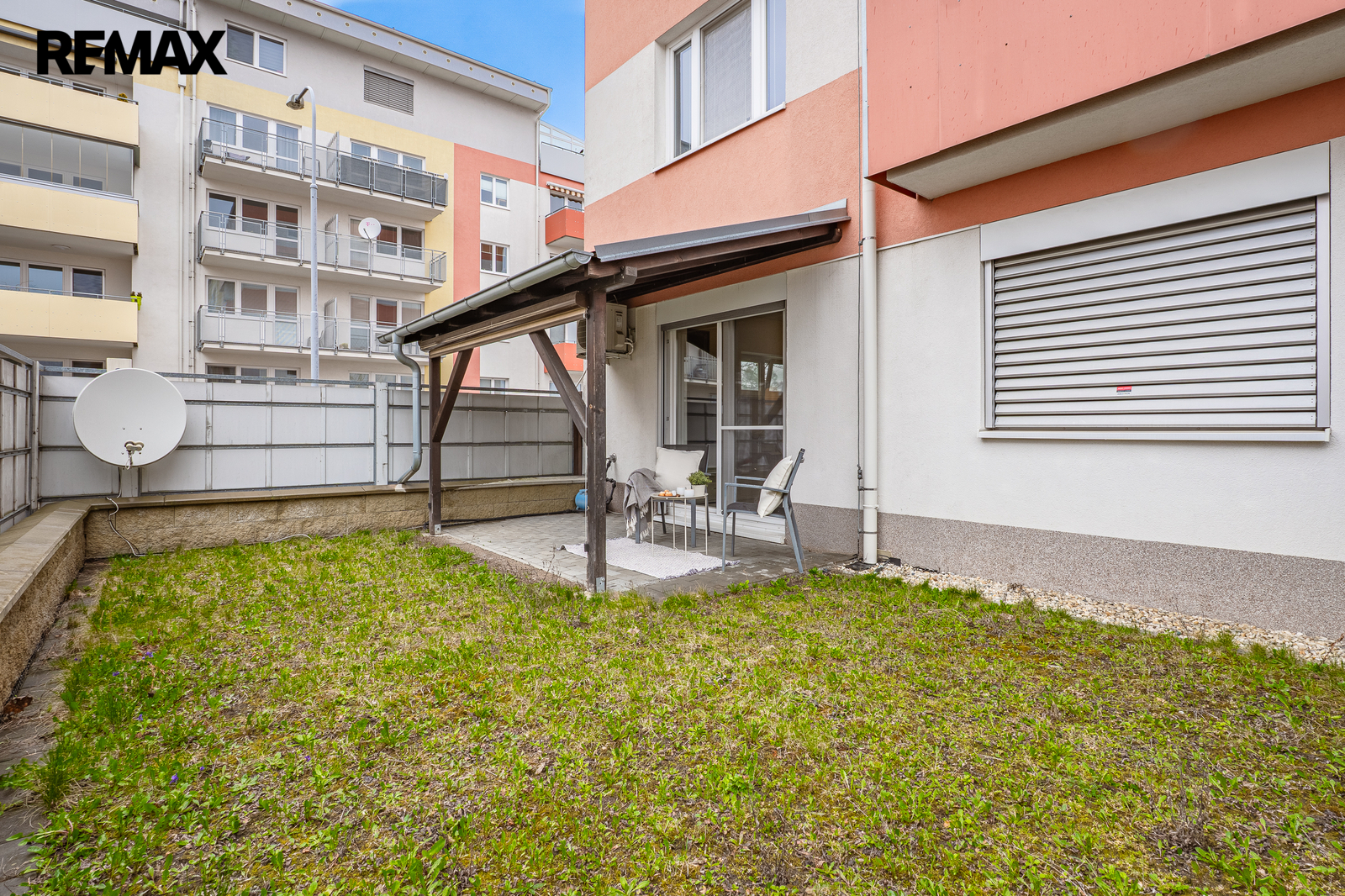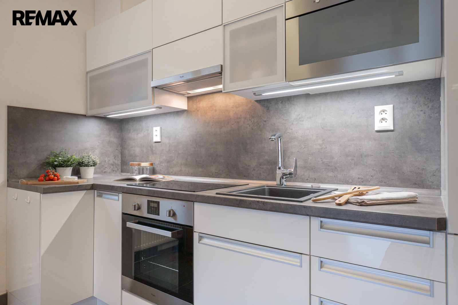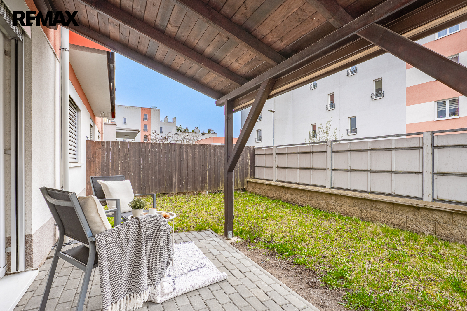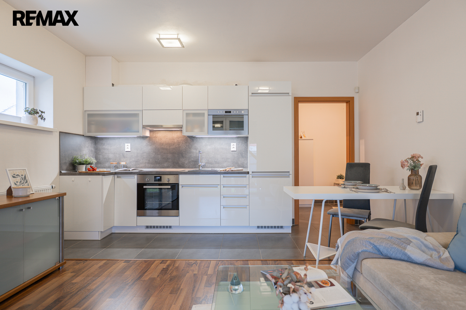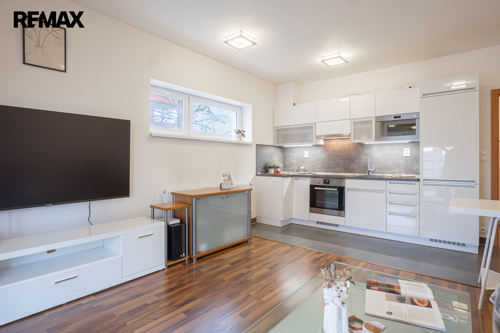 Byt nabízí moderní kuchyňskou linku s vestavěnými spotřebiči, otevřený obývací prostor s jídelním koutem a přímým vstupem na zahradu.