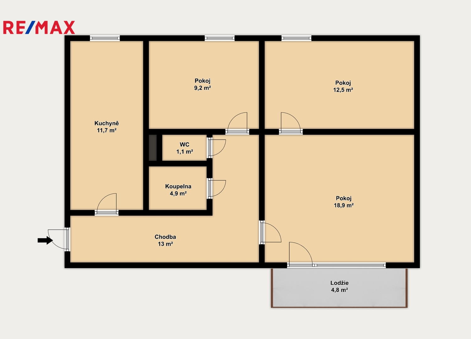 Byt má užitnou plochu 72,3 m² a nabízí prakticky řešenou dispozici se dvěma neprůchozími pokoji, obývacím pokojem, samostatnou kuchyní, koupelnou, WC a prostornou vstupní chodbou s prostornou vestavěnou skříní. Součástí bytu je také zasklená lodžie o velikosti 4,8 m² orientovaná na jih a sklepní kóje.