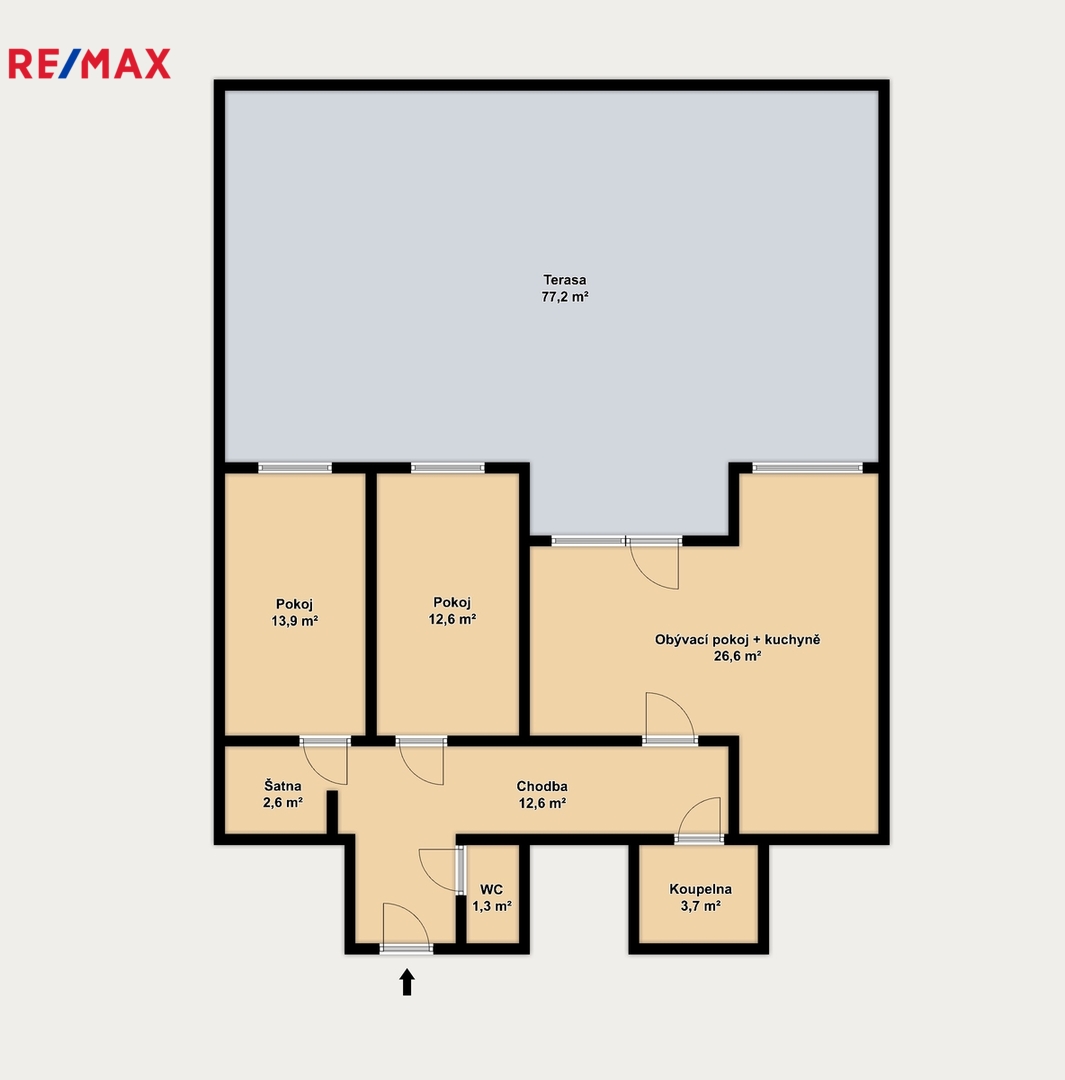 Obývací pokoj s kuchyní (26,6 m²) tvoří přirozené centrum bytu – světlý, prostorný a ideální pro každodenní život i posezení s přáteli. Dvě samostatné ložnice (13,9 m² a 12,6 m²) poskytnou dostatek prostoru pro rodinu, hosty nebo třeba domácí kancelář.