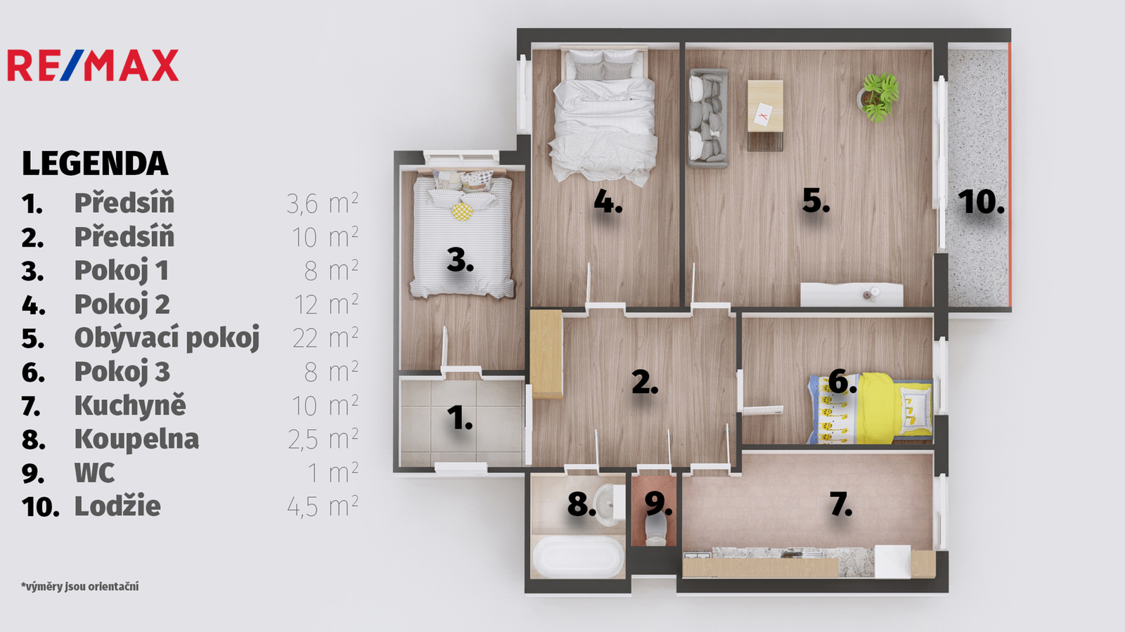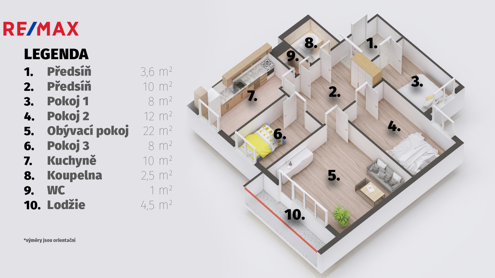 Celková plocha 85 m² (obytná 79 m² + zasklená lodžie 4,1 m² + sklep 2 m²)