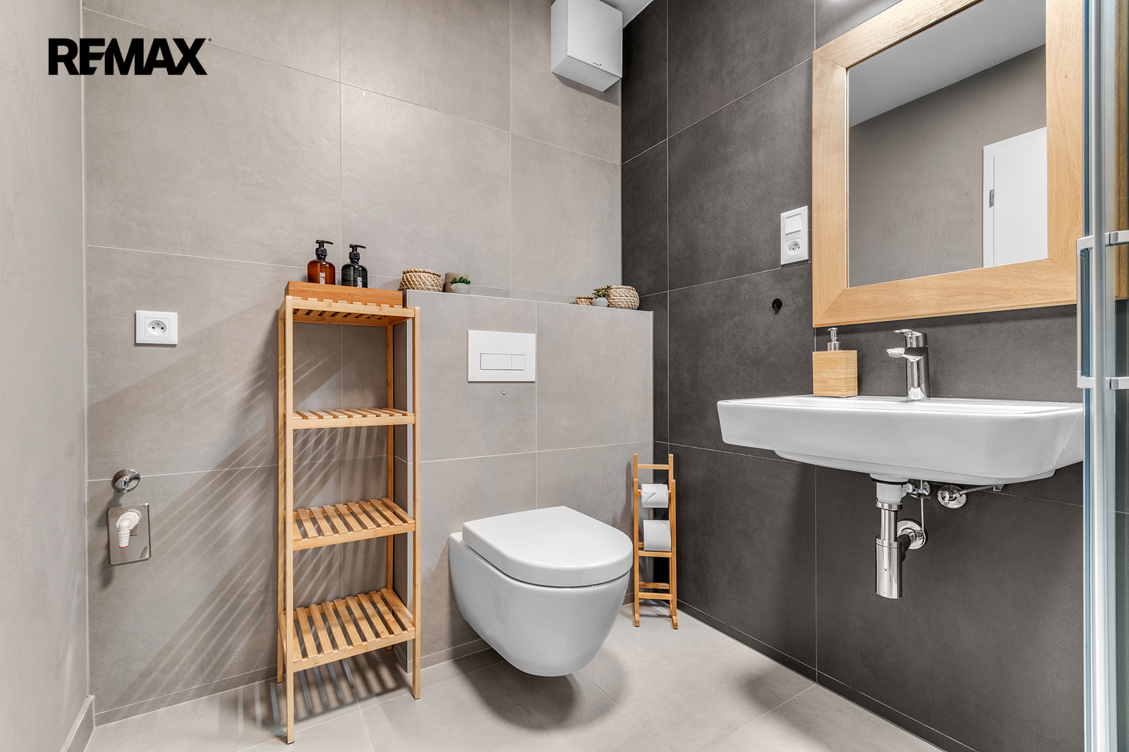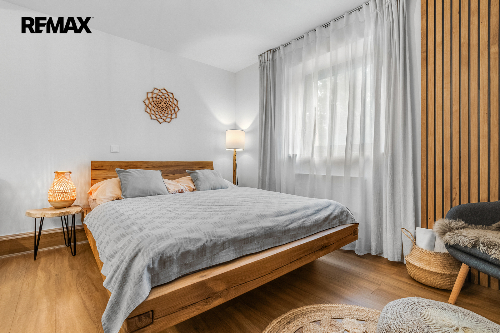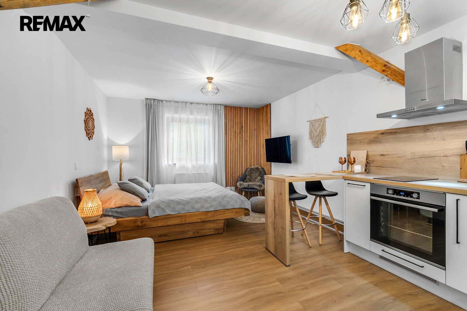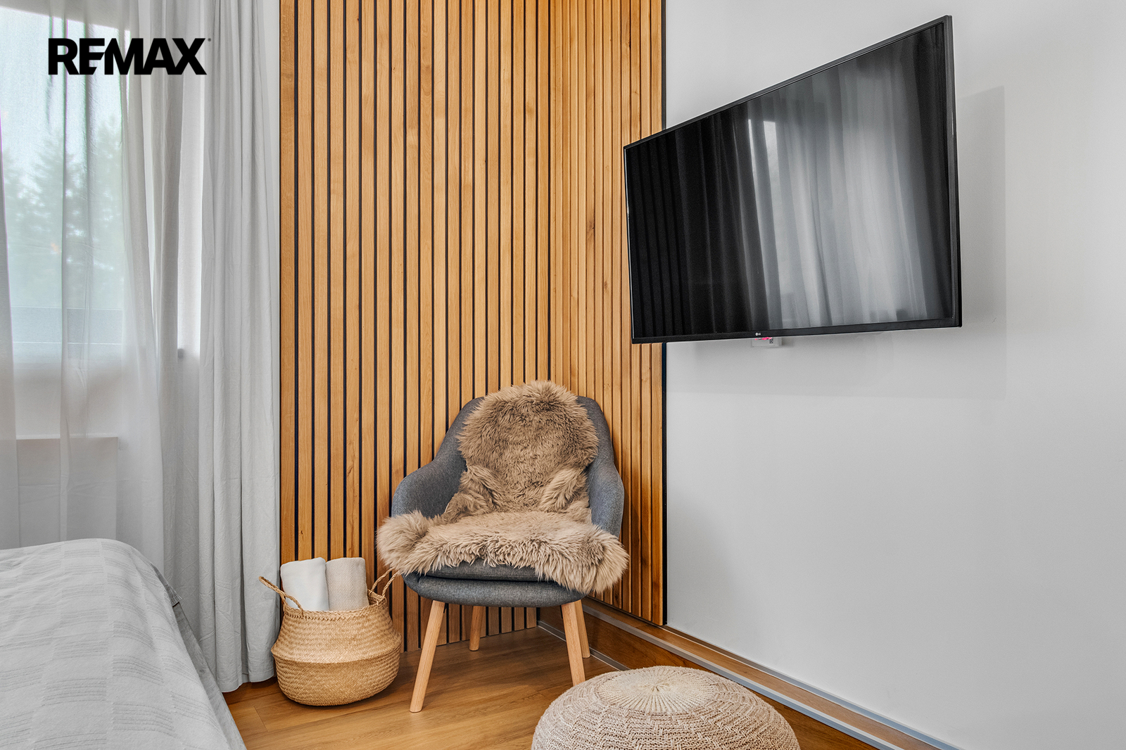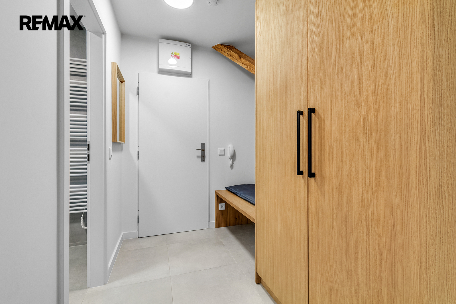 Interiér je řešen velmi prakticky a zároveň stylově – k dispozici je vstupní předsíň s vestavěnou skříní a dřevěnou šatní stěnou, moderní koupelna se sprchovým koutem a toaletou a hlavní obytný prostor propojující obývací část, ložnici a kuchyňský kout. Samozřejmostí je kompletní vybavení, díky kterému je apartmán připraven k okamžitému užívání i pronájmu.