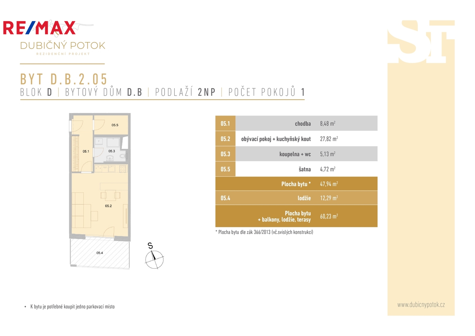Nabízíme exkluzivní bytovou jednotku 1+kk (D.B.2.05) v rezidenci Dubičný Potok v Českých Budějovicích. K prostorné ploše 47,94 m² náleží také velká lodžie 12,29 m², která poskytuje dostatek soukromí i místa k odpočinku. Dispozice 2+kk lze dosáhnout pomocí úpravy formou příčky (není součástí ceny). Touto úpravou si oddělíte spací prostor od obytné místnosti.