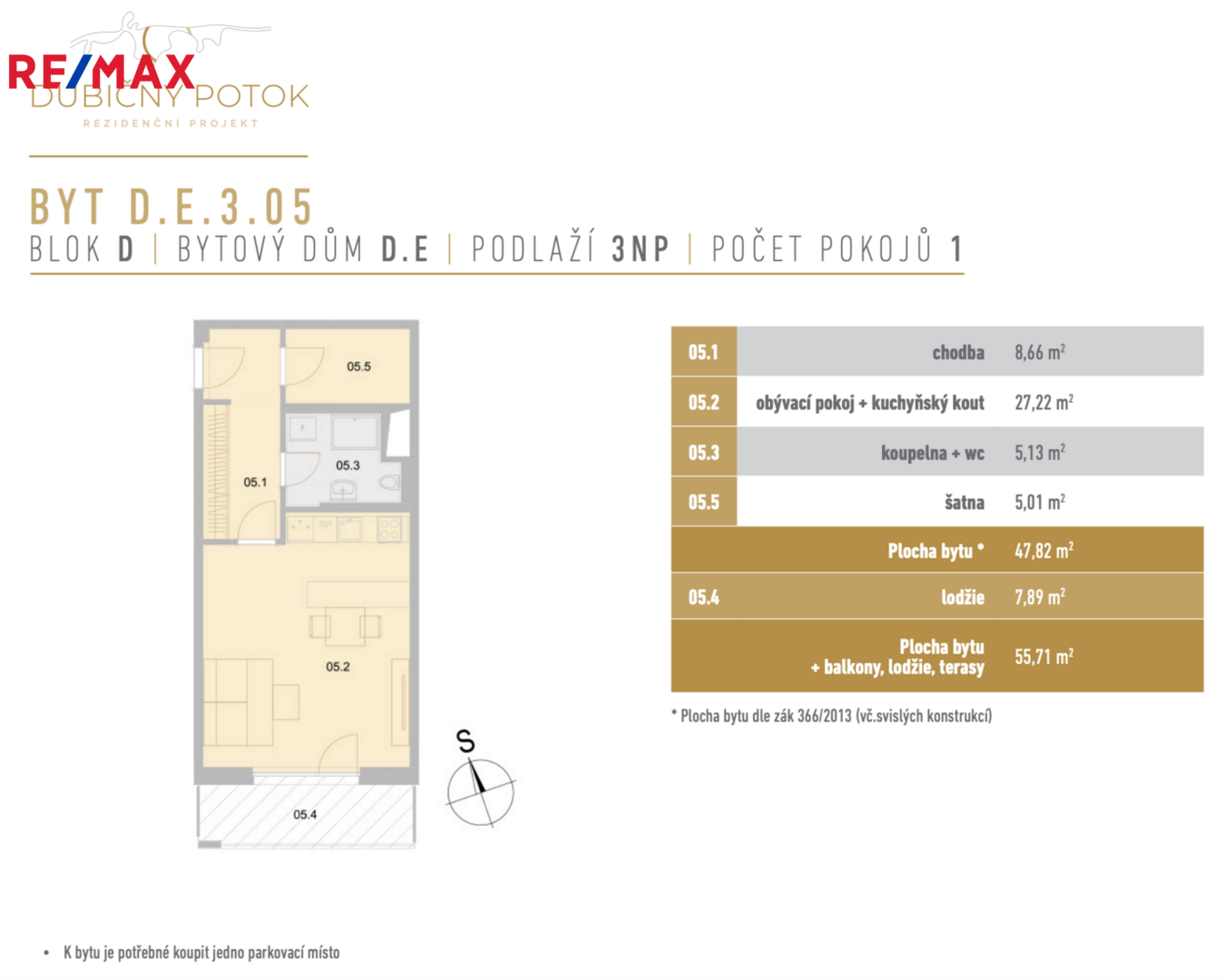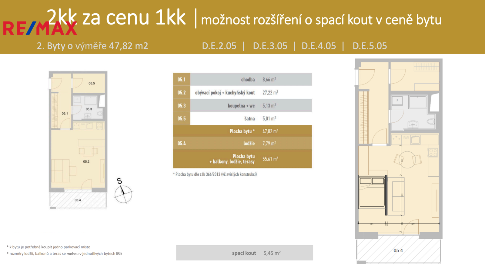 Nabízíme bytovou jednotku D.E.3.05. Dispozice 2+kk za cenu 1+kk o celkové výměře 55,71 m2 vás nadchne svým komfortem a luxusním životním stylem. U vybraných bytů vám totiž nabízíme možnost úpravy dispozic formou příčky bez navýšení ceny. Touto úpravou si oddělíte spací prostor od obytné místnosti.