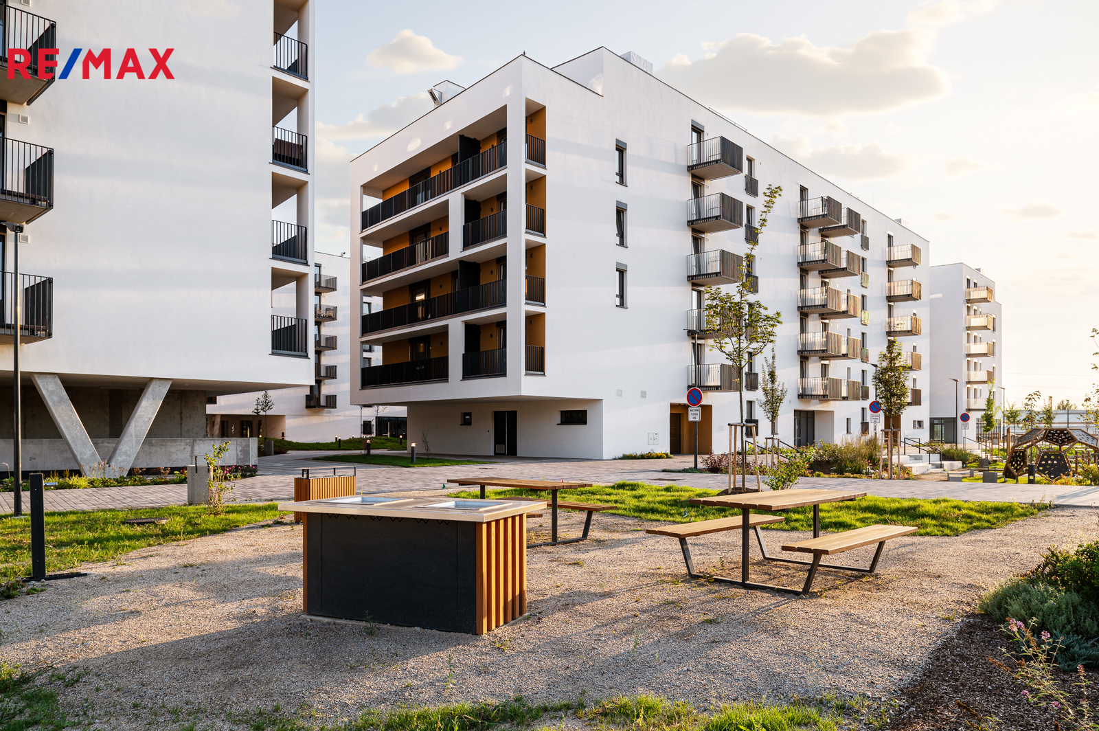 Veřejné prostranství je navrženo udržitelně – zelené střechy spolu s atriem pomáhají optimalizovat mikroklima budov. Součástí projektu je také cyklostezka, kolárna a myčka kol.