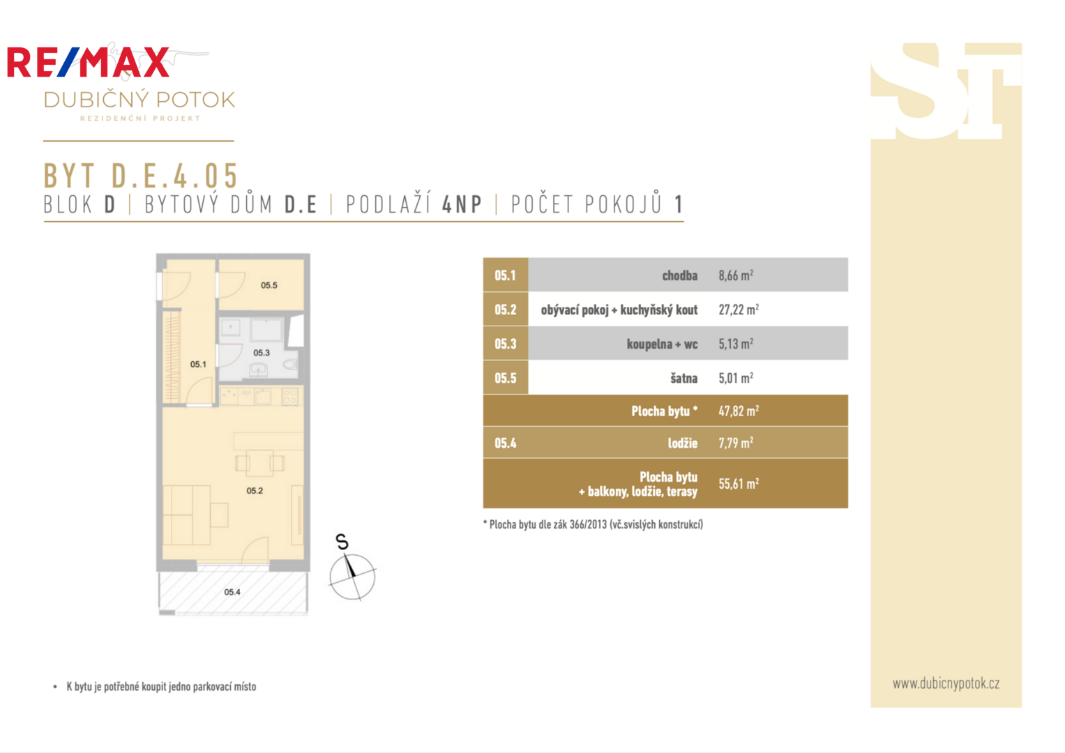 Nabízíme bytovou jednotku D.E.4.05. Dispozice 1+kk o výměře 47,82 m² s velkorysou lodžií (7,79 m²) vás nadchne svým komfortem a luxusním životním stylem. K bytu dále náleží sklep o výměře 2,2 m², který poskytuje praktický úložný prostor. Byt je připraven k okamžitému nastěhování.