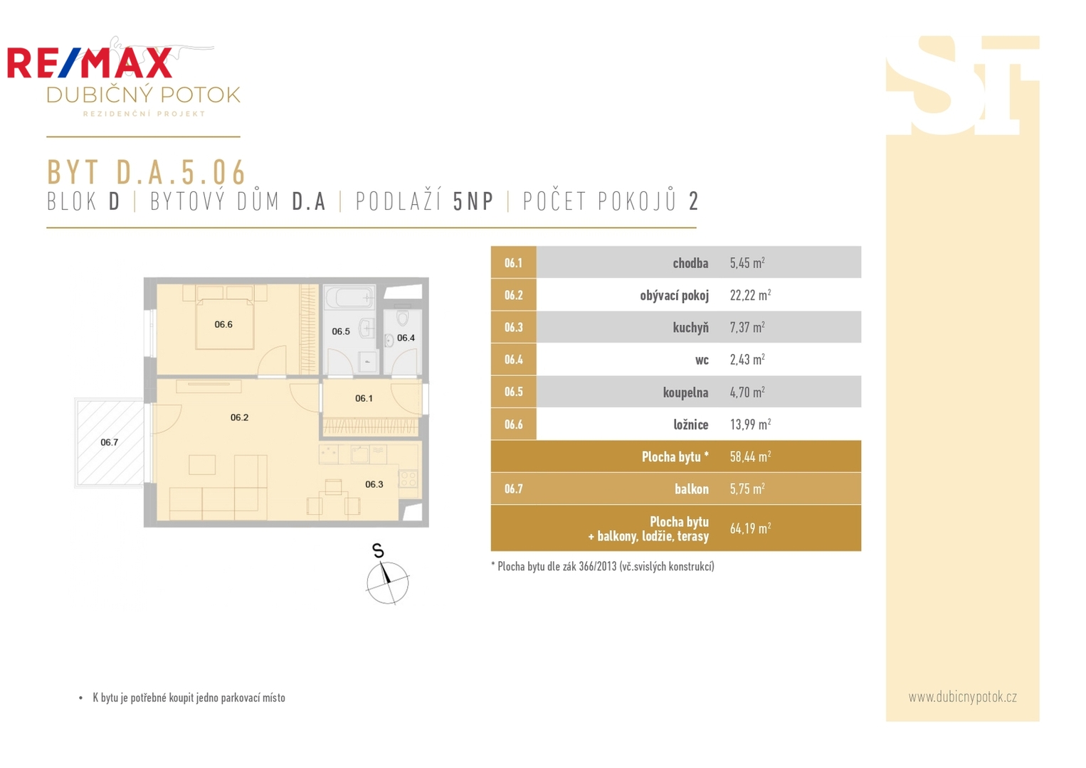 Moderní novostavba, promyšlená dispozice a příjemná lokalita blízko přírody i města dělají z tohoto bytu skvělou volbu pro pohodový život bez kompromisů. Jedná se o exkluzivní bytovou jednotku 2+kk (D.A.5.06) v rezidenci Dubičný Potok v Českých Budějovicích. K prostorné ploše 58,44 m² náleží také hluboký a široký balkon 5,75 m2, na který si pohodlně umístíte balkonový nábytek a květiny či stromky. Byt je připraven k okamžitému nastěhování.