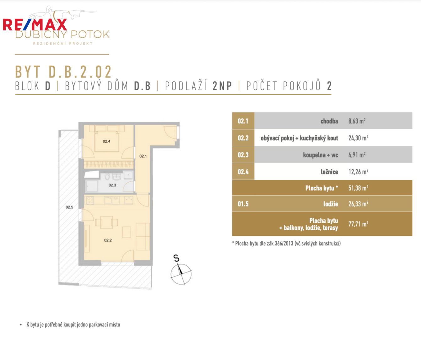 Nabízíme ke koupi prakticky řešenou dispozici 2+kk (označení D.B.2.02) v projektu Dubičný potok. Byt o výměře 51,38 m² se nachází ve 2. nadzemním podlaží. Jeho velkou předností je nadstandardně prostorná lodžie o výměře 26,33 m², která nabízí velkorysý prostor pro odpočinek venku. K bytu dále náleží sklep o velikosti 1,3 m². Nutností ke koupi tohoto bytu je i zakoupení jednoho parkovacího místa v podzemní garáži za cenu 395 000 Kč.