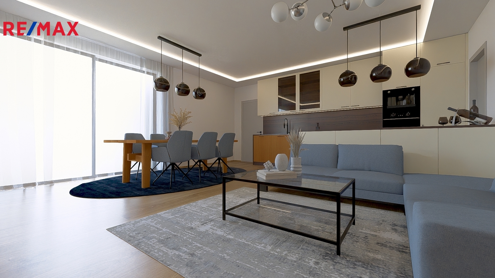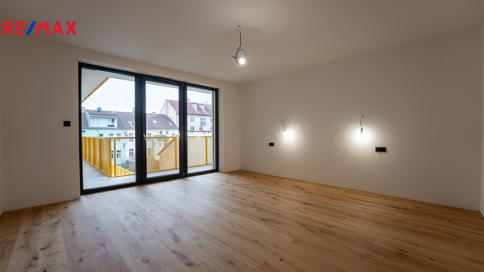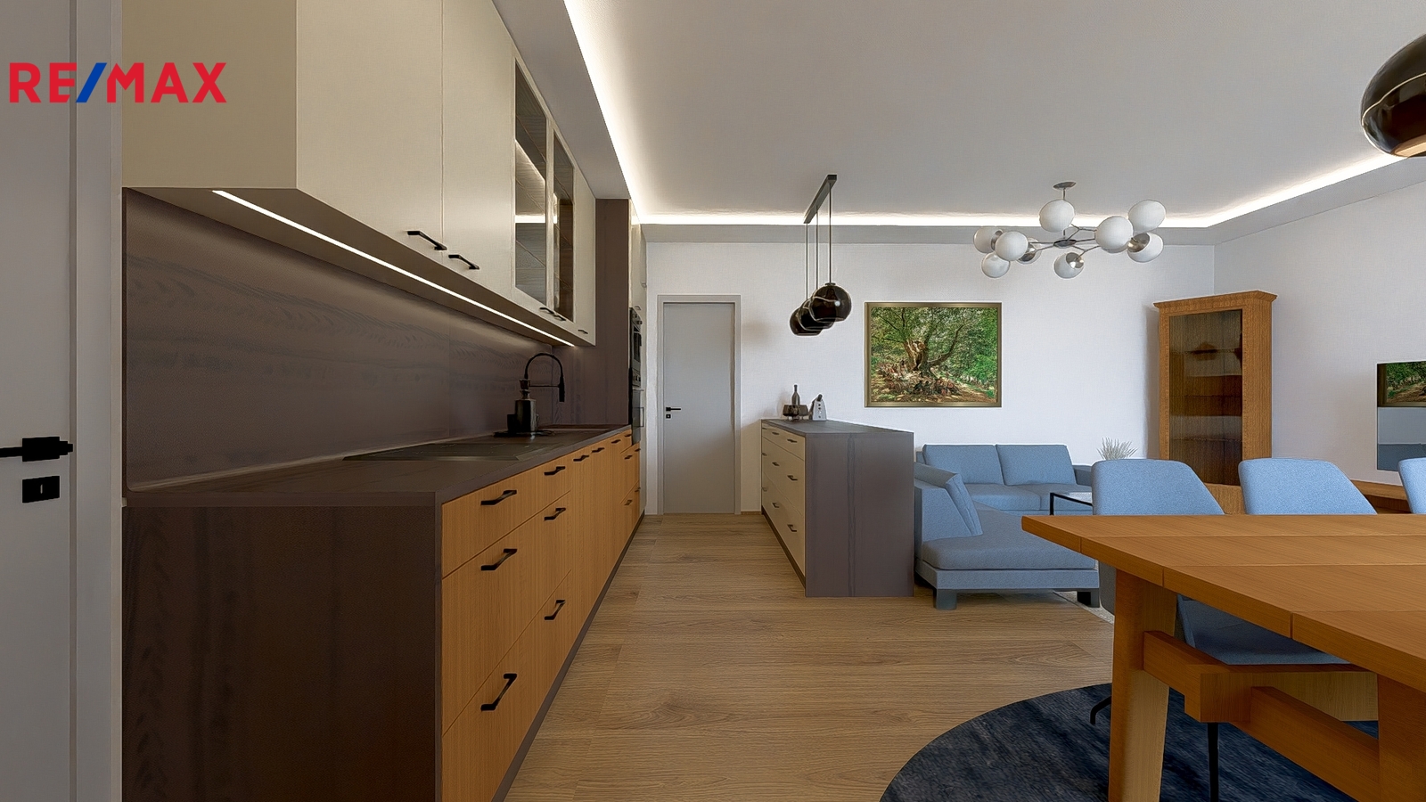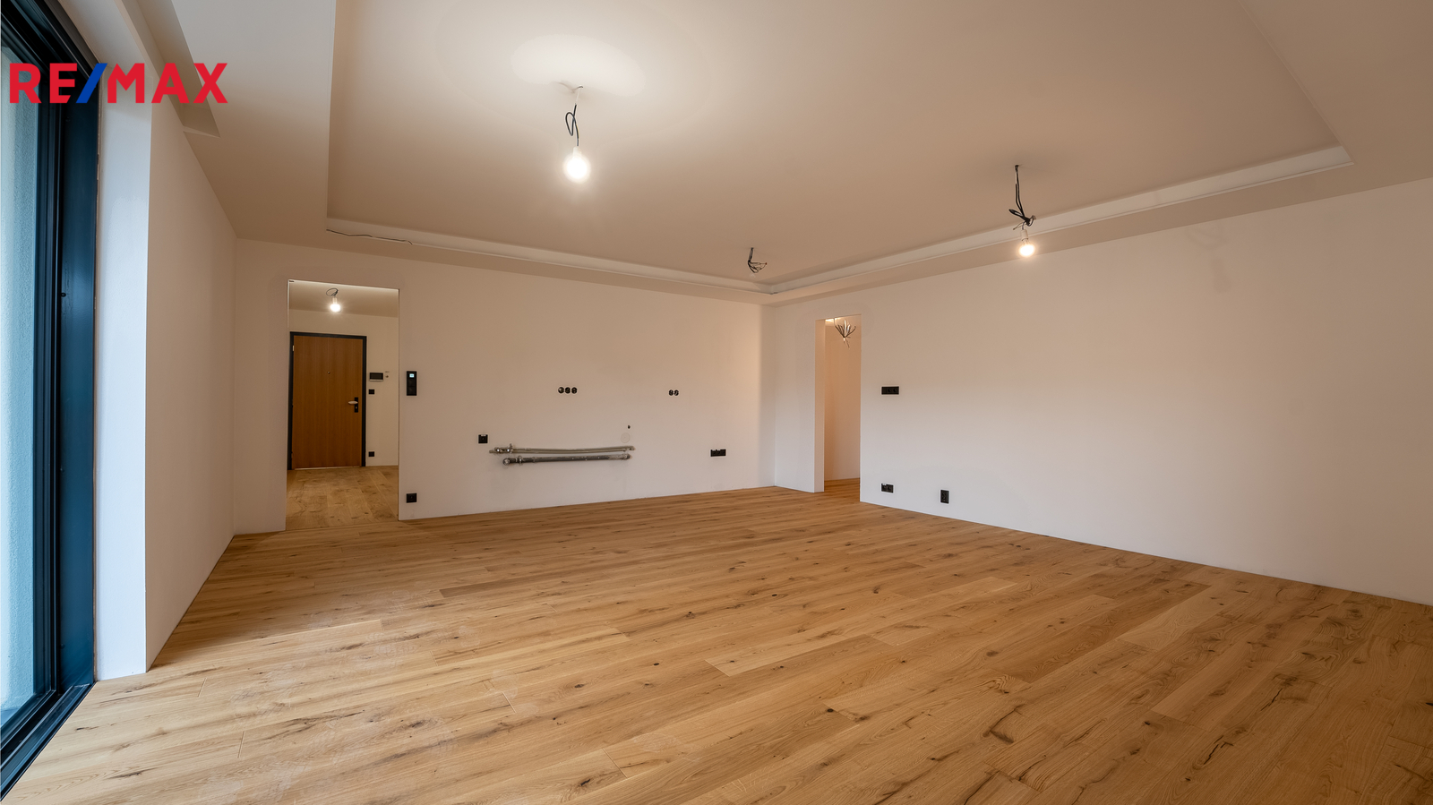 Dominantou bytu je velkorysý obývací pokoj s kuchyňským koutem a praktickou spíží, jehož plocha odpovídá bytu 1+kk. Ložnice je umístěna v klidové části bytu a nabízí maximální soukromí – disponuje vlastní šatnou a koupelnou. Druhá, prostorná koupelna je situována centrálně a je pohodlně dostupná z celého bytu.