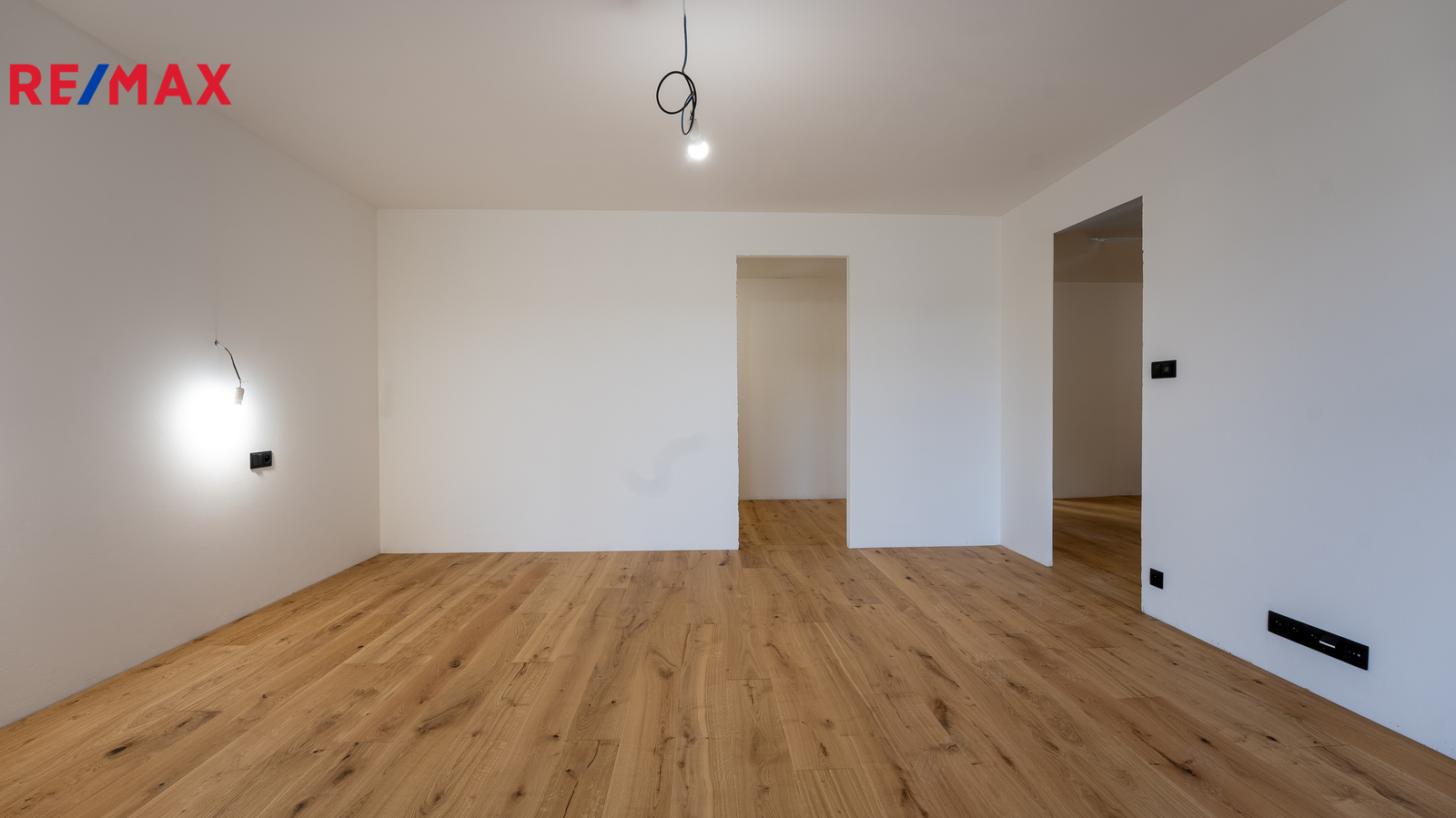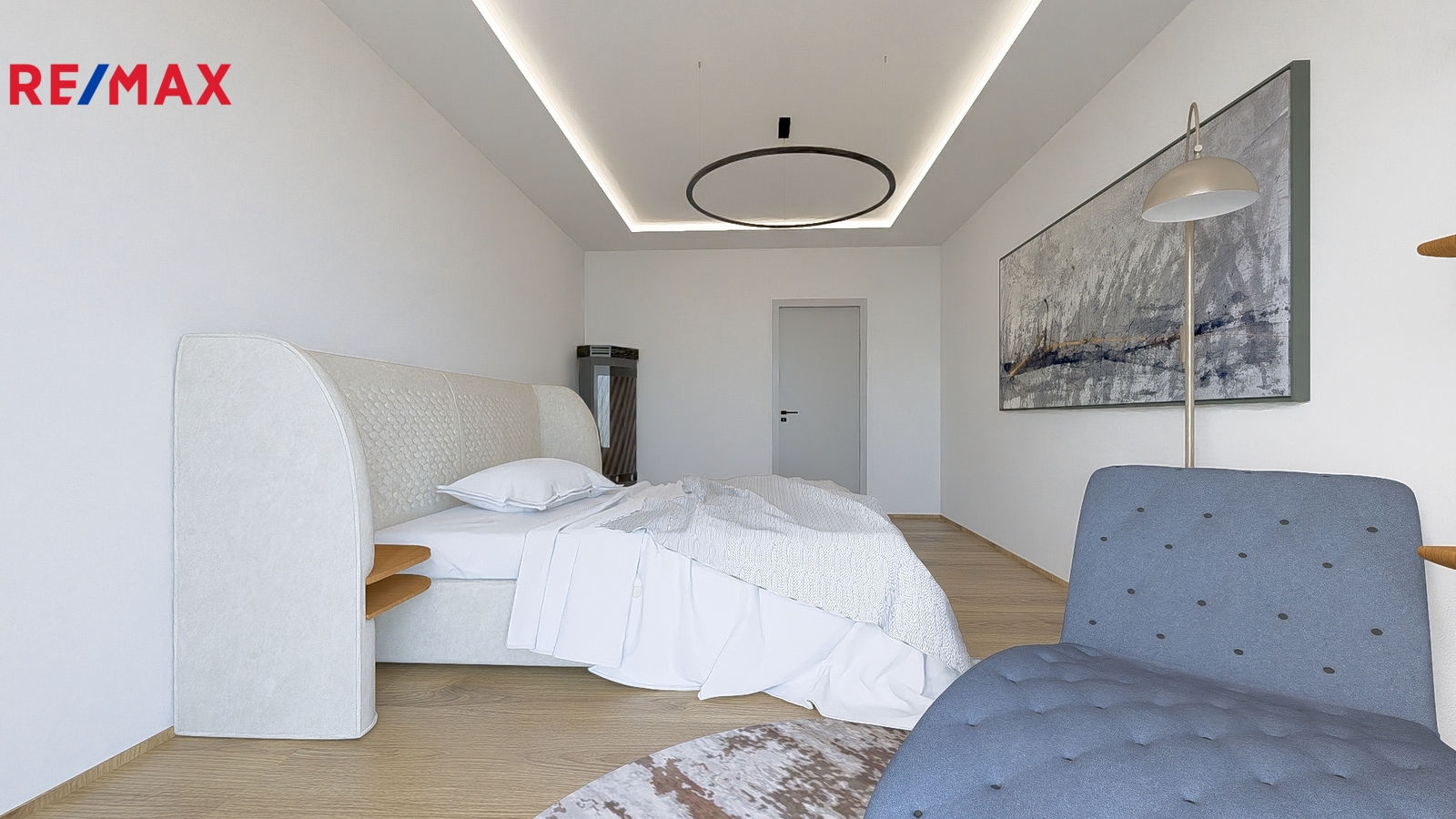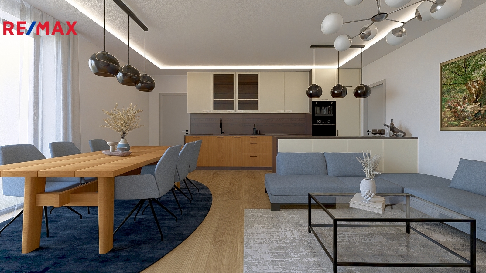 Dominantou bytu je velkorysý obývací pokoj s kuchyňským koutem a praktickou spíží, jehož plocha odpovídá bytu 1+kk. Ložnice je umístěna v klidové části bytu a nabízí maximální soukromí – disponuje vlastní šatnou a koupelnou. Druhá, prostorná koupelna je situována centrálně a je pohodlně dostupná z celého bytu.