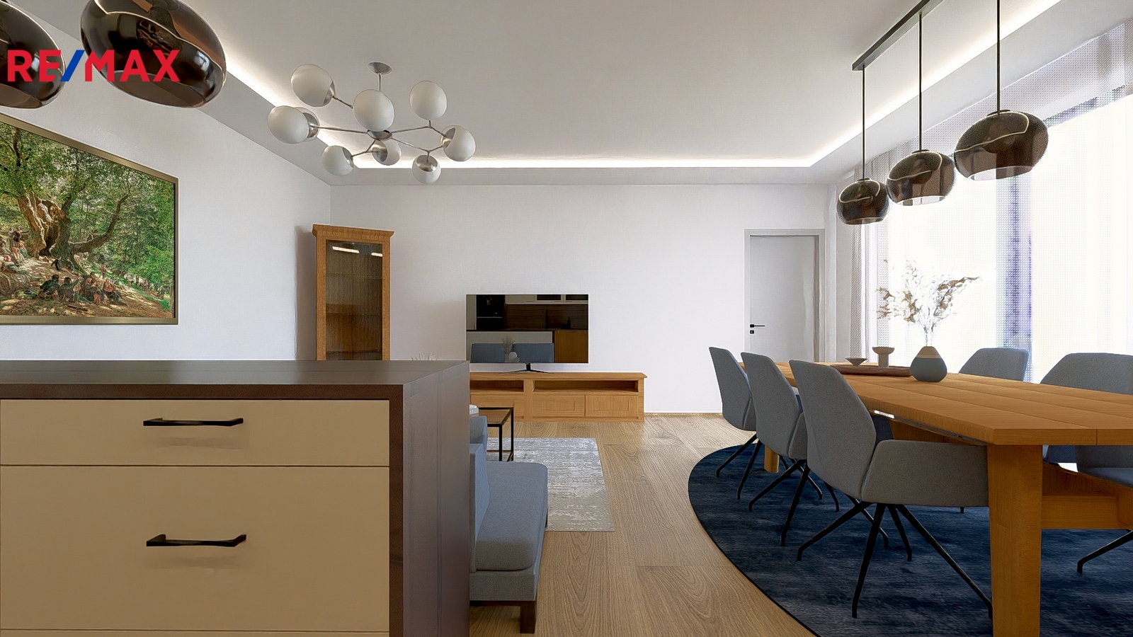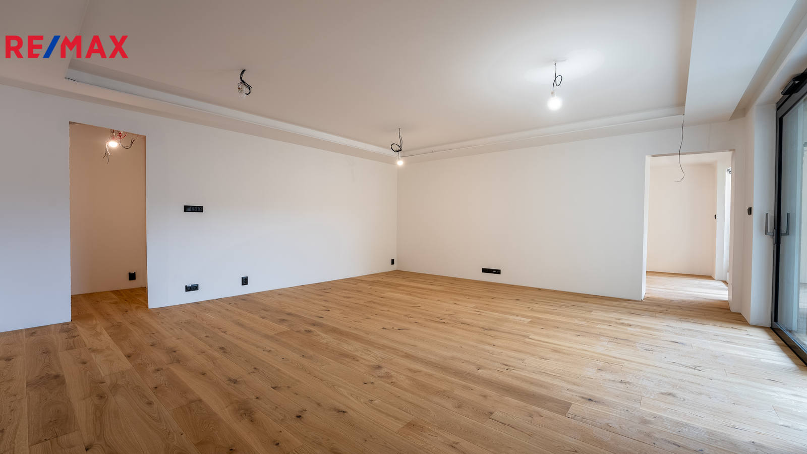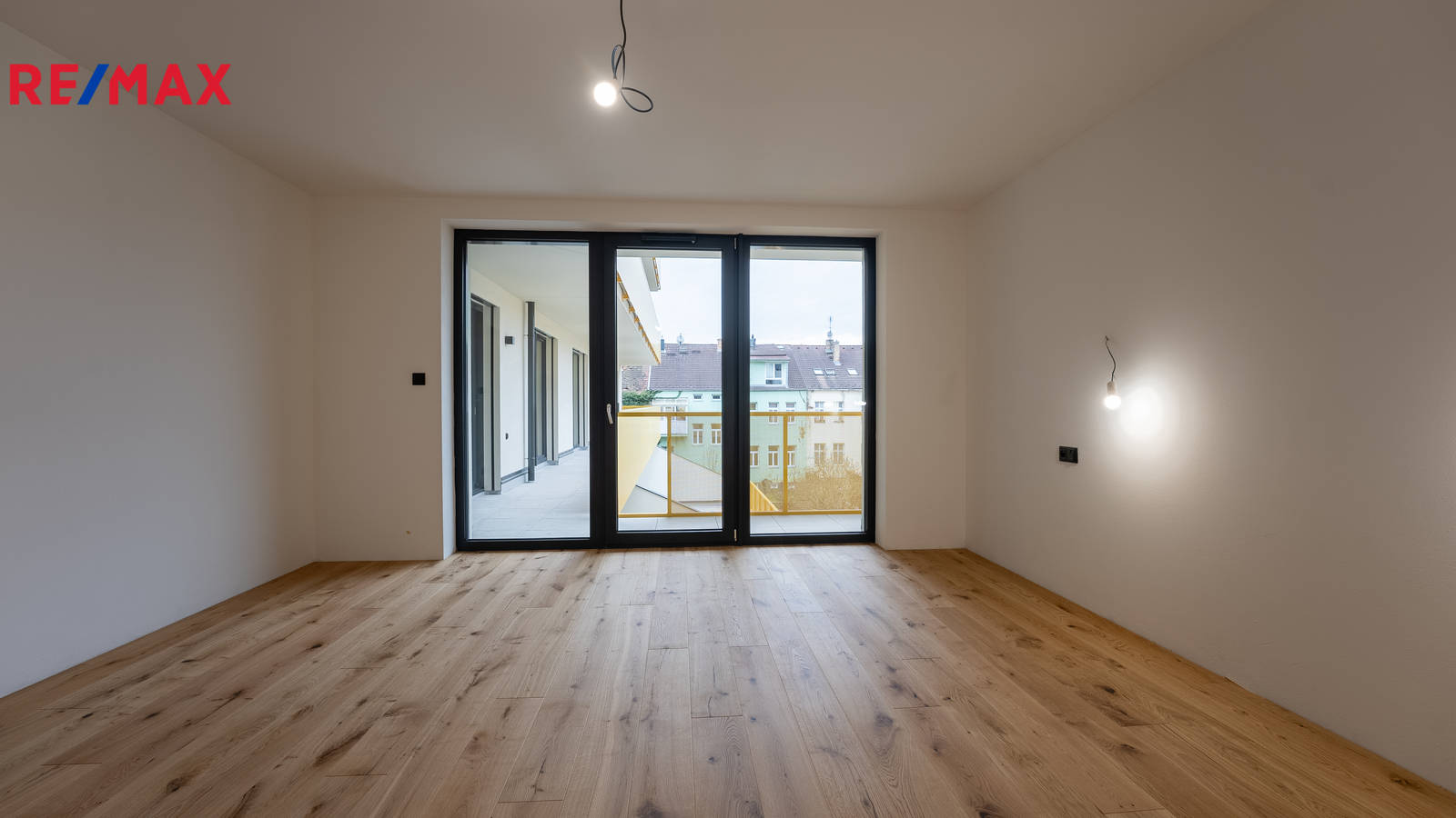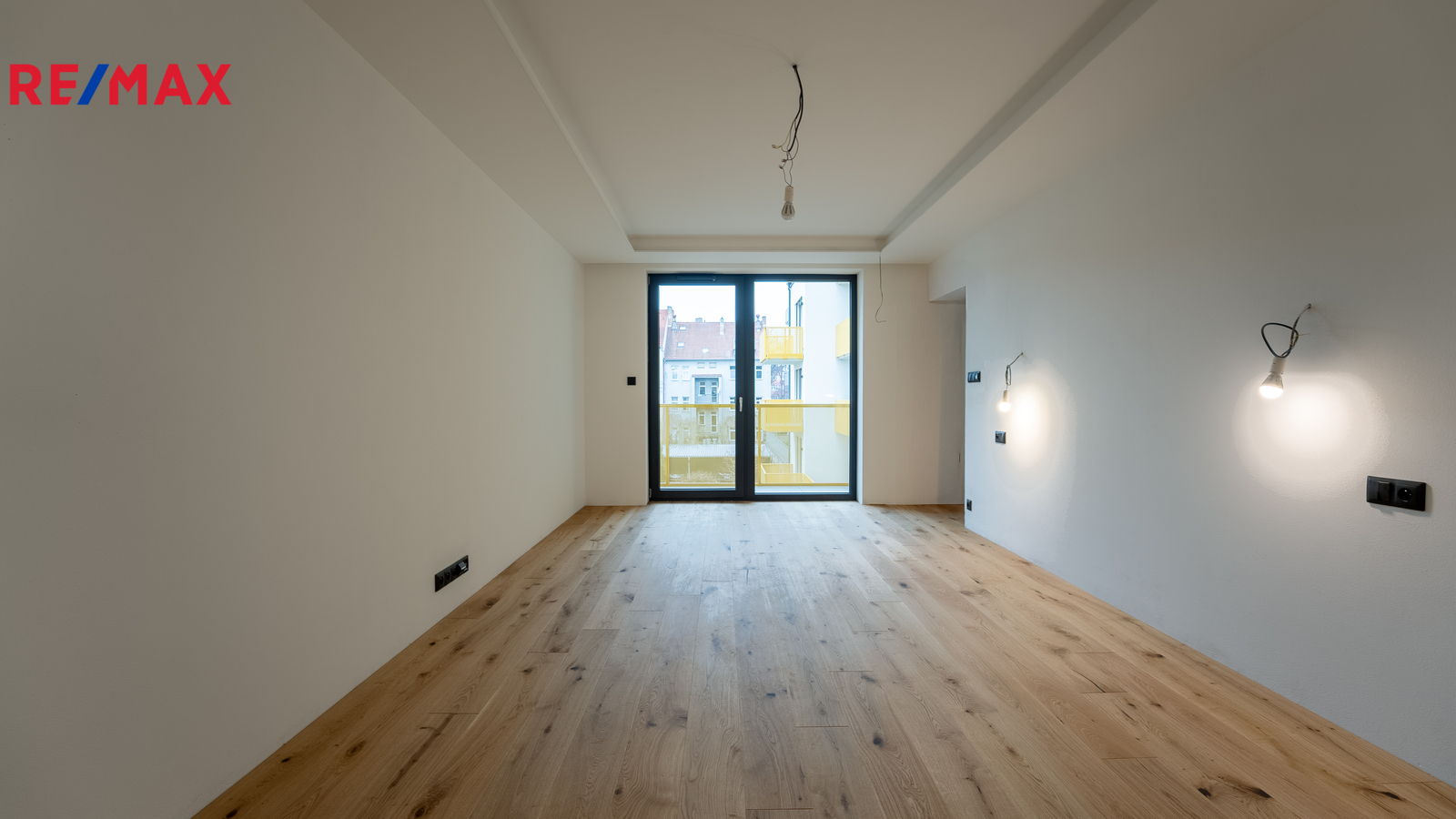 Dominantou bytu je velkorysý obývací pokoj s kuchyňským koutem a praktickou spíží, jehož plocha odpovídá bytu 1+kk. Ložnice je umístěna v klidové části bytu a nabízí maximální soukromí – disponuje vlastní šatnou a koupelnou. Druhá, prostorná koupelna je situována centrálně a je pohodlně dostupná z celého bytu.