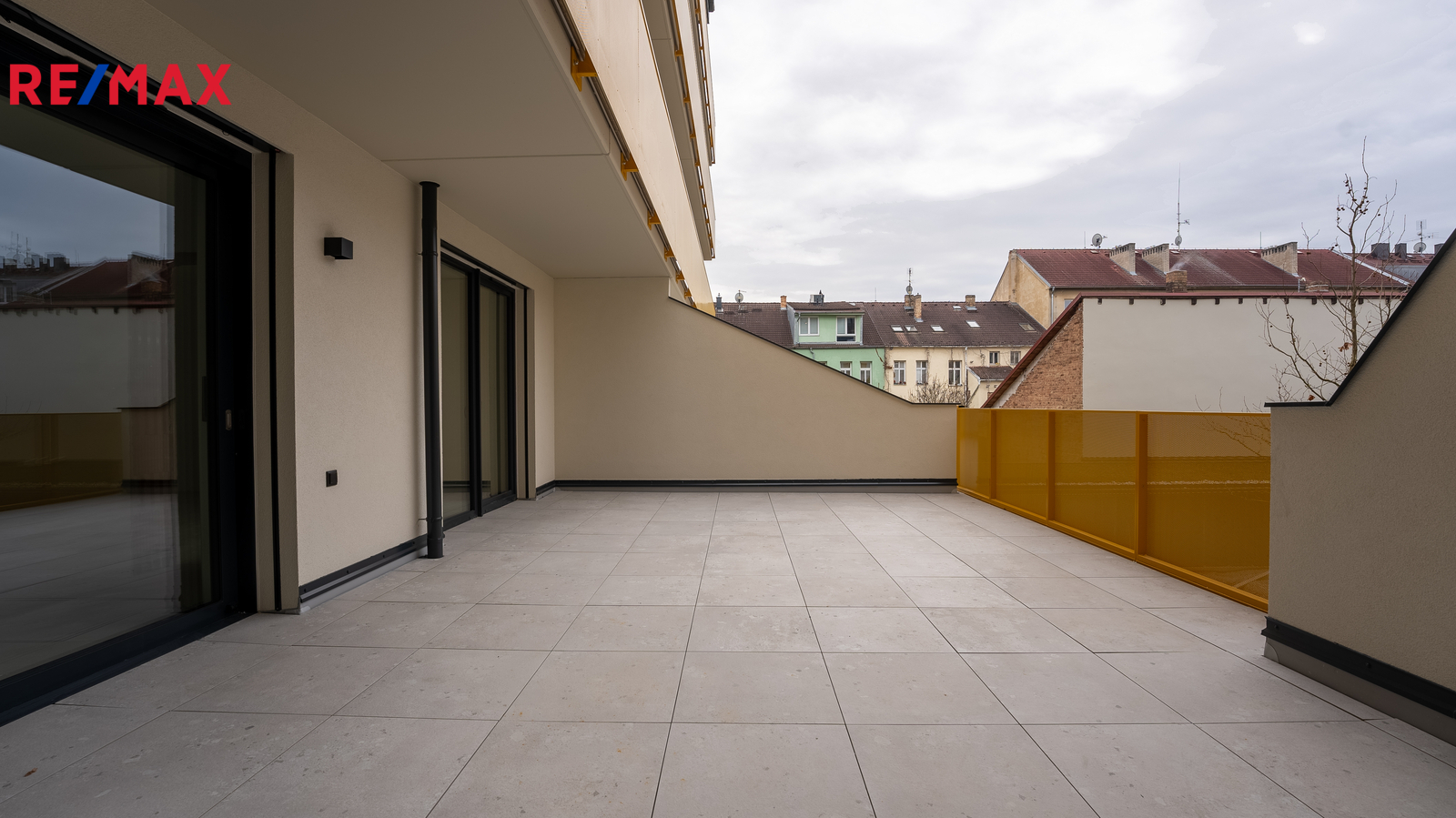 Skutečnou třešničkou na dortu je rozlehlá terasa do tvaru L, částečně krytá, která poskytuje dostatek prostoru pro relaxaci, posezení i zeleň. Vstup na terasu je ze všech obytných místností – přes francouzská okna nebo velkoformátový posuvný HS portál. Samozřejmostí jsou předokenní žaluzie. Byt je orientován na jih a západ, směrem do klidného vnitrobloku.