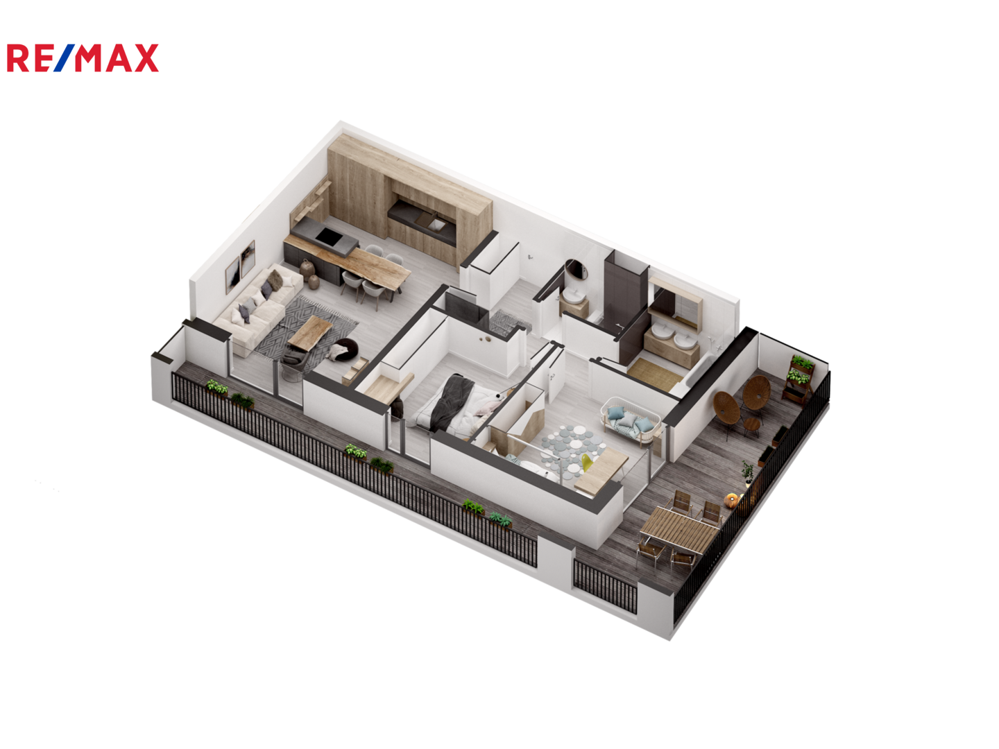 Základem bytu je prostorný obývací pokoj s kuchyňským koutem o velikosti 33,20 m², který nabízí dostatek místa pro kuchyni, jídelní část i pohodlnou obývací zónu. Byt dále disponuje ložnicí, dalším samostatným pokojem, dvěma koupelnami (jedna s vanou, druhá se sprchou a toaletou) a vstupní chodbou s prostorem pro úložná řešení.