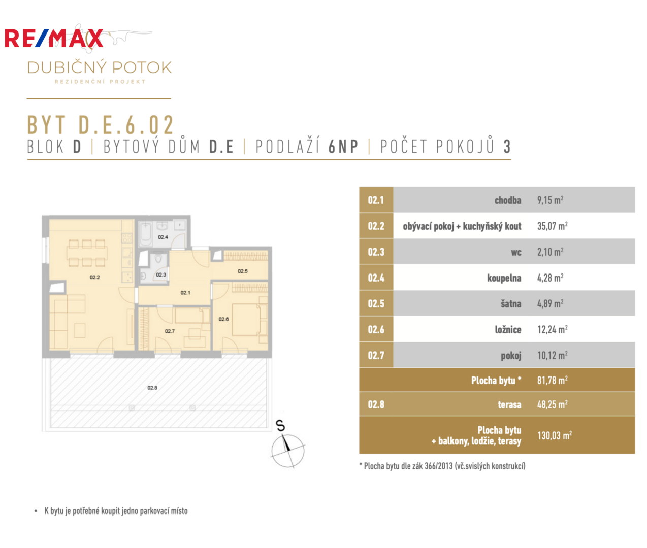 Nabízíme ke koupi prakticky řešenou dispozici 3+kk (označení D.E.6.02) v projektu Dubičný potok. Byt o výměře 81,78 m² se nachází v 6. nadzemním podlaží. K bytu náleží nadstandardně prostorná terasa o výměře 47,9 m², která nabízí velkorysý prostor pro odpočinek venku. Nutností ke koupi tohoto bytu je i zakoupení jednoho parkovacího místa v podzemní garáži za cenu 395 000 Kč.