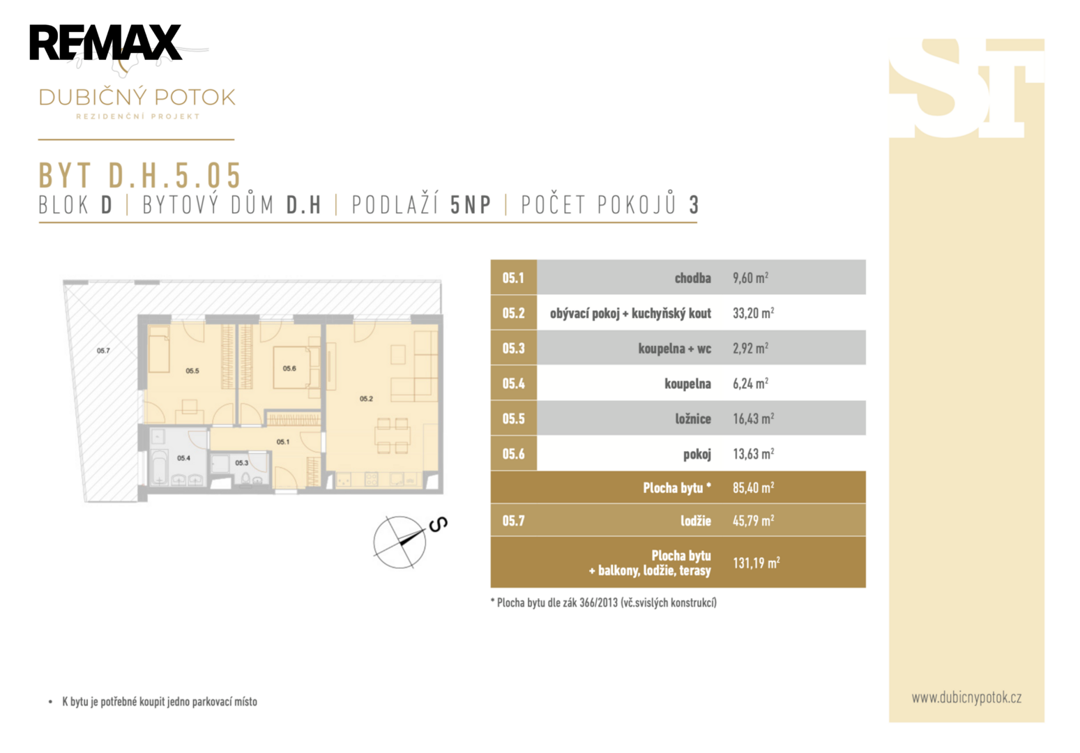 Nutností ke koupi tohoto bytu je i zakoupení jednoho parkovacího místa v podzemní garáži za cenu 395 000 Kč.