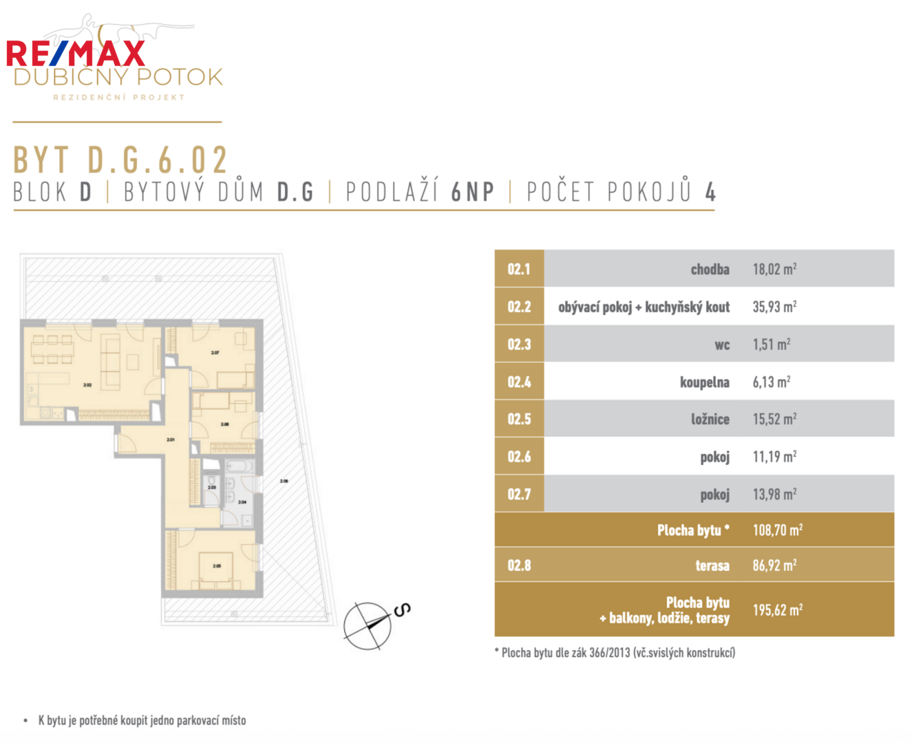 Nabízíme exkluzivní bytovou jednotku 4+kk D.G.6.02 v rezidenci Dubičný Potok v Českých Budějovicích. K prostorné ploše 108,70 m2 náleží velkorysá rohová terasa o výměře 86,92 m2. Byt je připraven k okamžitému nastěhování.