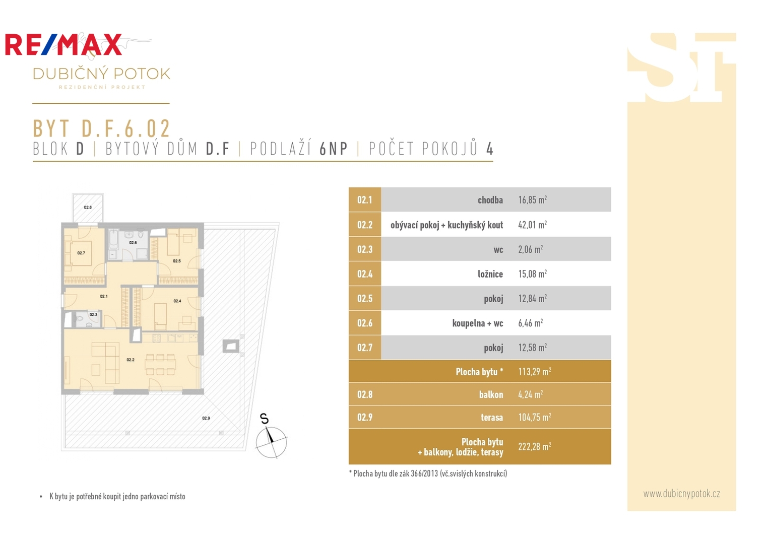 Nabízíme exkluzivní střešní bytovou jednotku 4+kk (D.F.6.02) o ploše 113,29 m² s jižně orientovanou terasou 103,9 m² a balkonem 4,5 m2 v rezidenci Dubičný Potok v Českých Budějovicích.