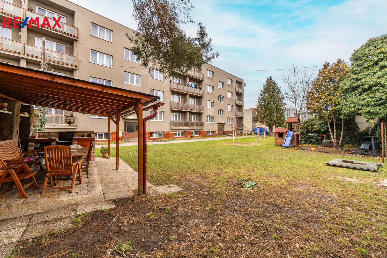 S koupí bytu získáte nejen podíl na pozemku pod domem, ale také podíl na přilehlé zahradě. Na té je k dispozici altánek s posezením a dětské hřiště.