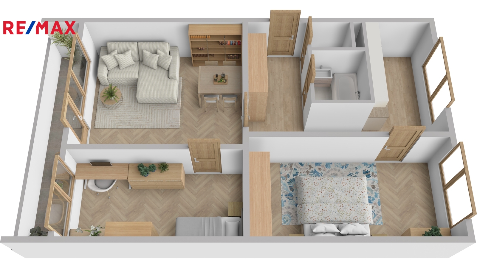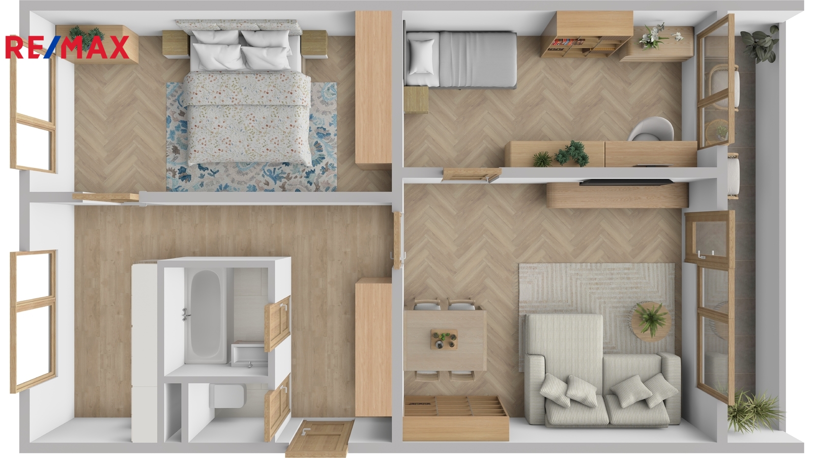 • Dispozice: byt má tři pokoje, samostatnou kuchyni a prostornou lodžii.