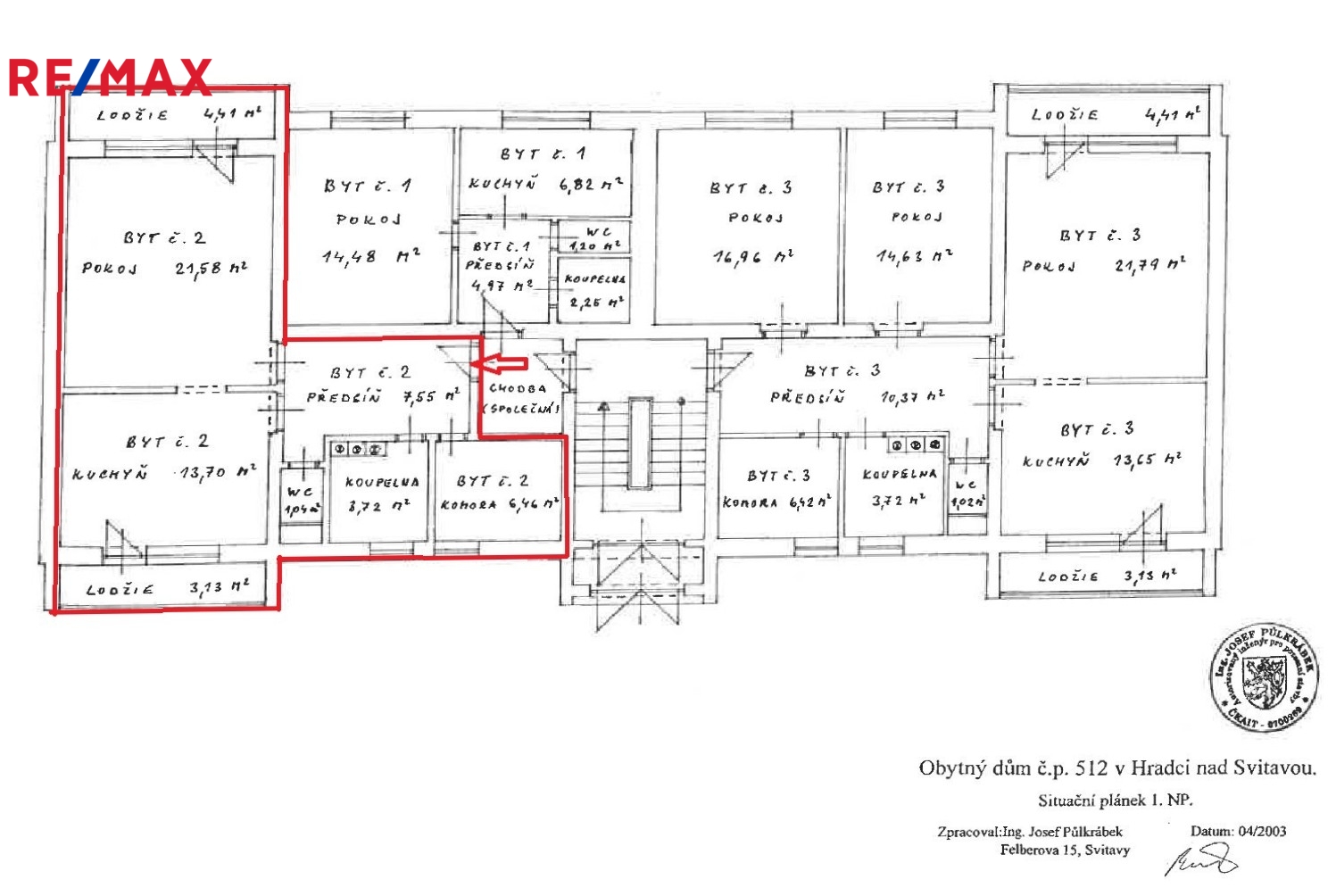 Celková užitná plocha bytu s příslušenstvím (sklepem a 2 lodžiemi) činí 66,91 m2, samotná plocha bytu 55,13 m2. K bytu patří sklep v suterénu domu o výměře 5 m2.