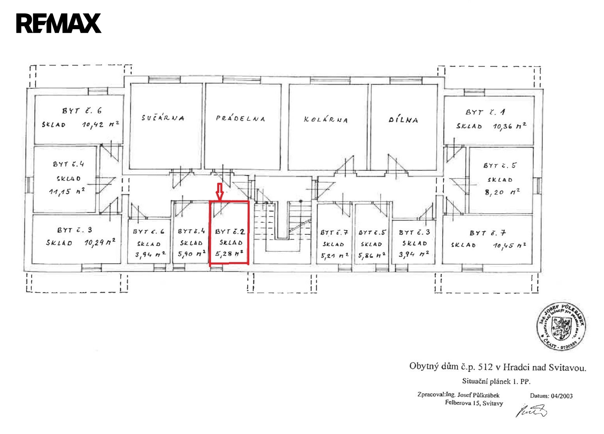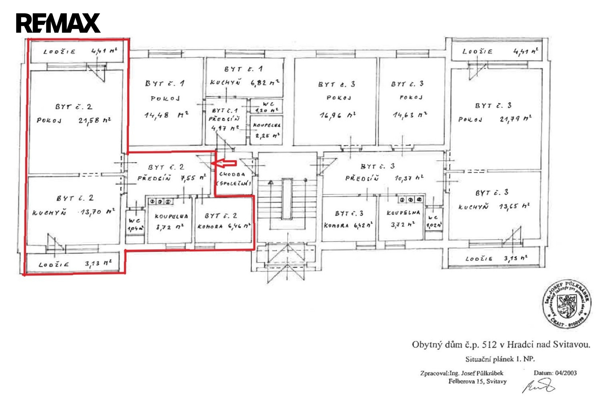 Celková užitná plocha bytu s přísl., tedy včetně sklepa a dvou lodžií činí 66,91 m2, samotná plocha bytu 55,13 m2. Zděný sklep v suterénu domu má výměru 5 m2. Byt má nová plastová okna, včetně balkónových dveří, v bytě dále proběhla modernizace sociální zařízení, kdy byla vyměněna vana za sprchový kout. Byt má vlastní plynové vytápění včetně ohřevu teplé vody.