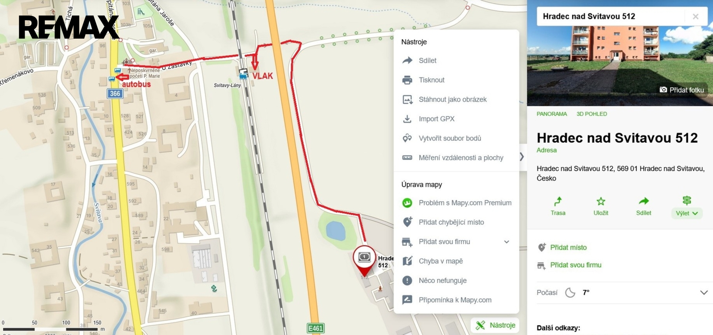 Do centra Svitav trvá cesta autem necelé 4 km asi 5 až 6 minut cesty. Lze dobře cestovat i veřejnou dopravou, bezproblémové spojení je vlakem i autobusem ze zastávky (Svitavy-Lány) v dosahu 5 minut chůze od domu.