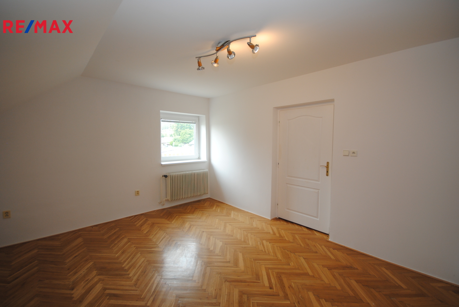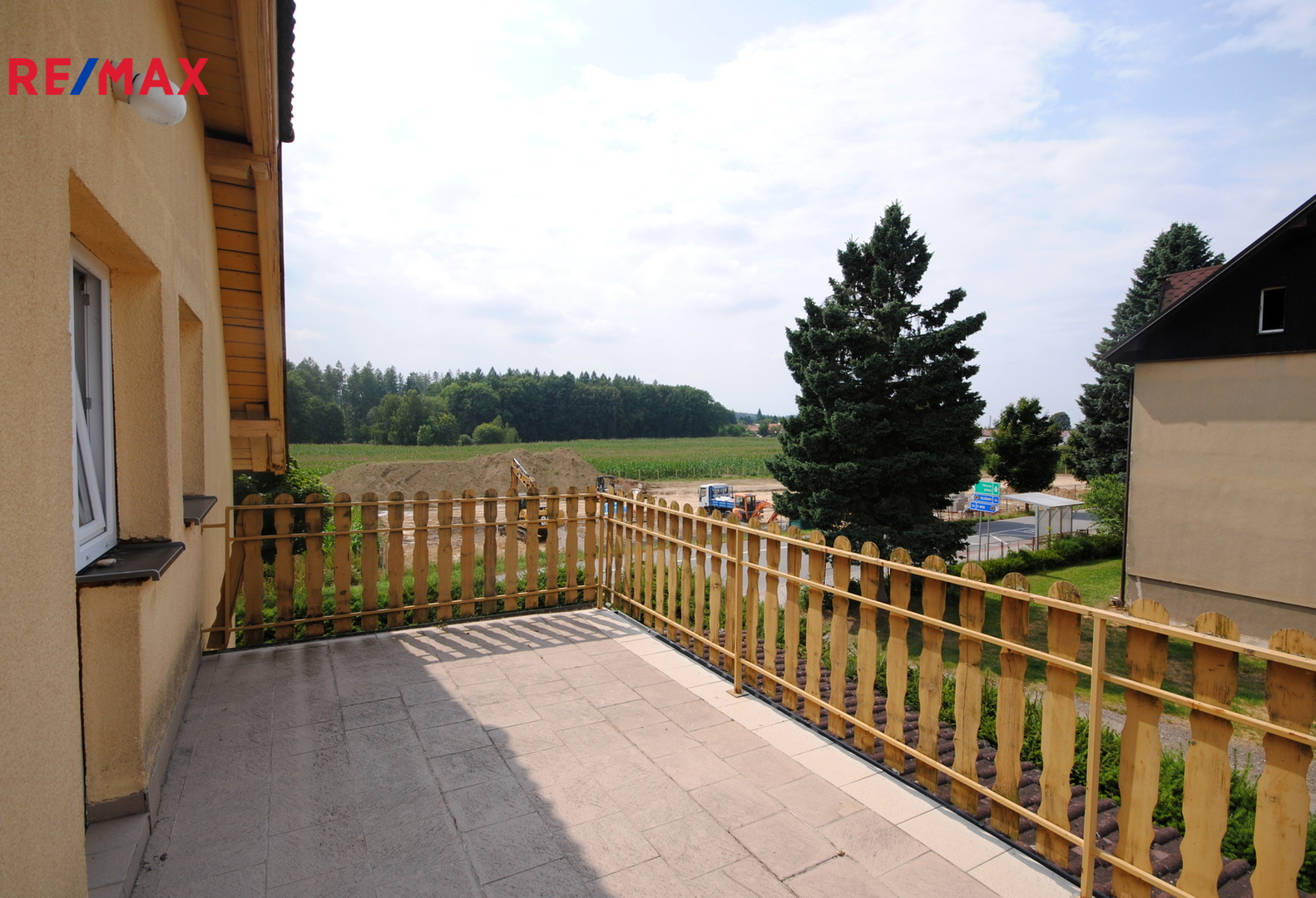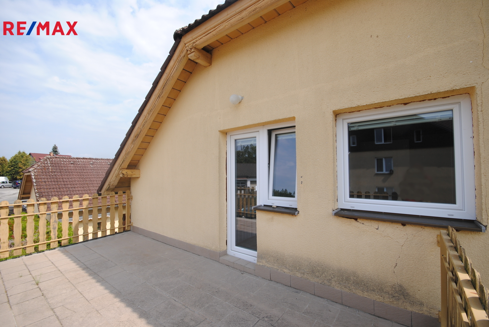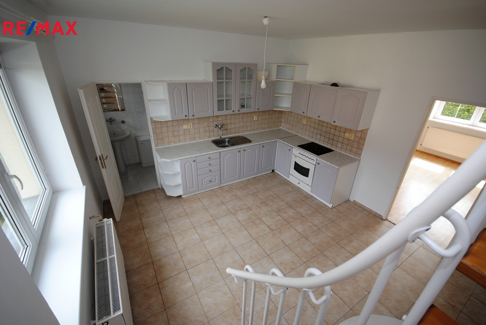 Nabízíme k prodeji mezonetový byt v rodinném domě, který byl prohlášením vlastníka rozdělen na dvě velké, stavebně i provozně zcela oddělené bytové jednotky, každá s vlastním vstupem, zahradou, terasou i sklepem. Reálně tak majitel bydlí v polovině dvojdomku. Prodávaná bytová jednotka má dispozici 4+1 s podlahovou plochou 102 m2, terasu v patře domu o ploše 16 m2 a sklep taktéž o výměře 16 m2. Velkou předností tohoto bytu je oplocená zahrada o celkové ploše 237 m2. Mezonetový byt je situován do přízemí a patra, přičemž přízemí je dispozičně členěno na závětří, vstupní chodbu s komorou, samostatným WC a spíží, na kterou navazuje velkoprostorová obytná kuchyně, samostatný obývací pokoj a koupelna s vanou. Horní podlaží bytu je přístupné po schodišti z prostoru obytné kuchyně a dispozičně nabízí centrální chodbu ze které jsou jednotlivé vchody do dvou větších pokojů a jednoho malého pokojíku a menší koupelny se sprchovým koutem. Taktéž vstup na terasu je z této chodby. Sklepní prostor je využitý především jako kotelna (kotel na dřevo, elektrokotel) a sklad paliva. Ohřev vody zajišťuje elektrický bojler v koupelně.