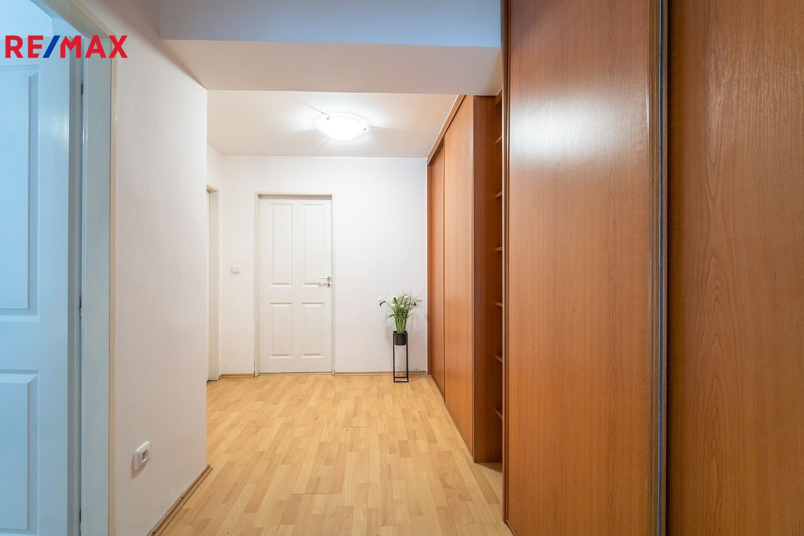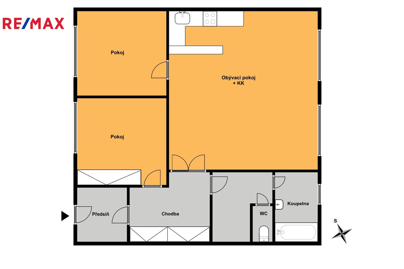 Jednotka se skládá ze vstupní chodby, která je po celé své délce vybavena prostornou vestavěnou skříní. Tu najdete i v jedné z ložnic. Velkorysý obývací pokoj s kuchyňským koutem skýtá prostor i pro jídelní kout. Na něj pak navazuje poslední ložnice.