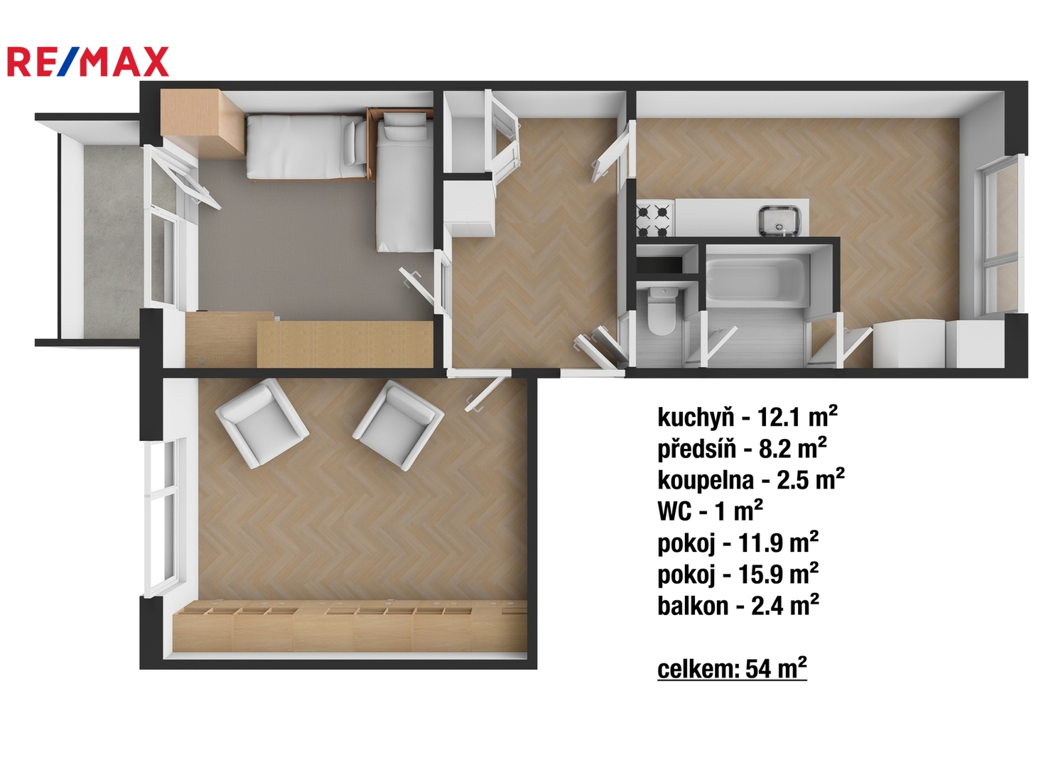 Byt má podlahovou plochu 52 m², k tomu balkon o výměře 2,5 m² a sklepní prostor v suterénu domu.