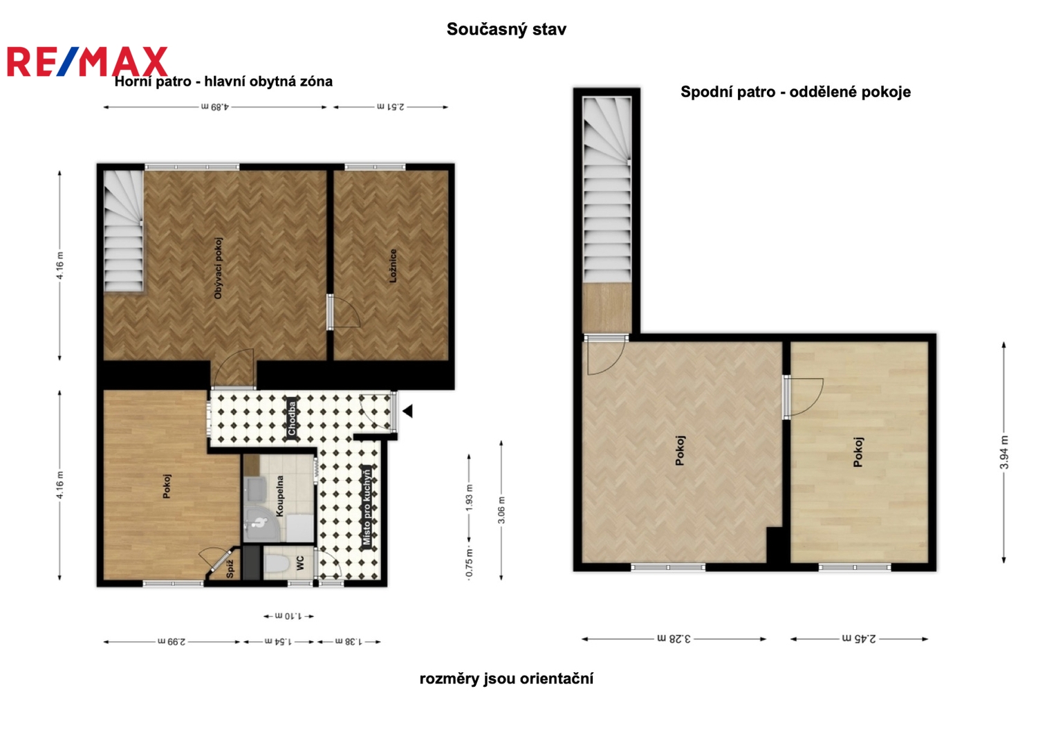 Byt byl původně řešený jako 3+1, dnes je upravený na 4+1 a jeho nejzajímavější vlastností je dvoupodlažní uspořádání. Hlavní obytná část se nachází ve zvýšeném přízemí a dva samostatné pokoje jsou umístěny o patro níže. Díky tomuto rozdělení působí byt úplně jinak než klasické dispozice, má přirozené oddělení prostoru a větší pocit soukromí.
