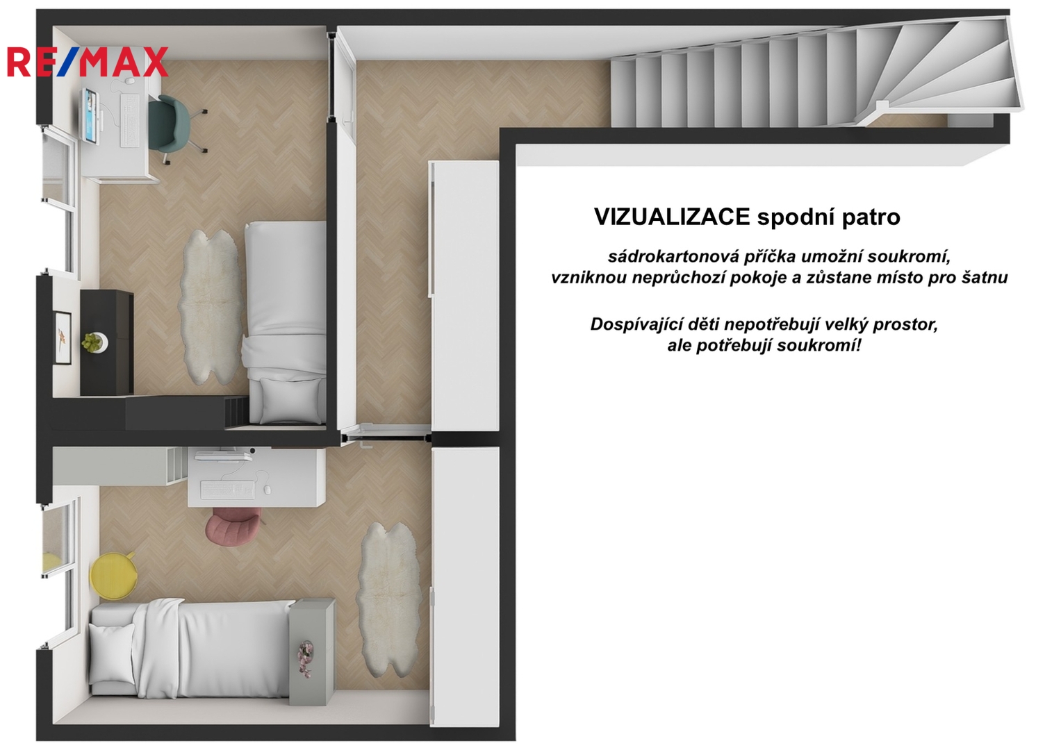 Právě proto může dobře fungovat pro rodinu s dospívajícími dětmi. V určitém věku každý ocení možnost mít svůj vlastní kout. Spodní pokoje ve svahu nad kinem Drahomíra jsou přibližně šest metrů nad terénem, takže nejde o typické přízemí. Pro děti mohou být ideálním pokojem, pro rodiče zase pracovnou, ateliérem nebo klidným místem pro práci z domova. Možností je víc, záleží jen na vás.