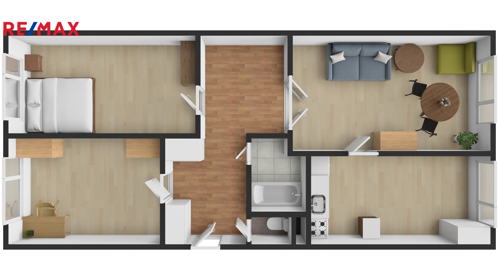 Dispozice bytu je velmi praktická – obývací pokoj s kuchyní je orientován na jih a díky tomu je prostor krásně prosvětlený po celý den. Dvě samostatné ložnice směřují na sever. Uprostřed nalezneme předsíň, která nabízí dostatek úložného prostoru. Byt je v udržovaném stavu – umakartové jádro a původní elektrorozvody. Dům prošel výměnou oken, opravou střechy, zateplením a je opatřen kamerovým systémem.