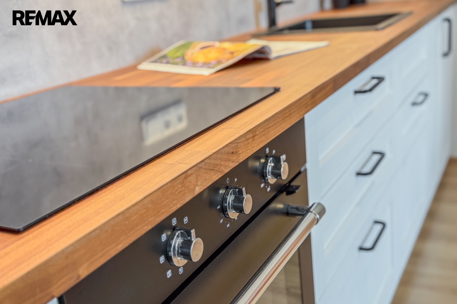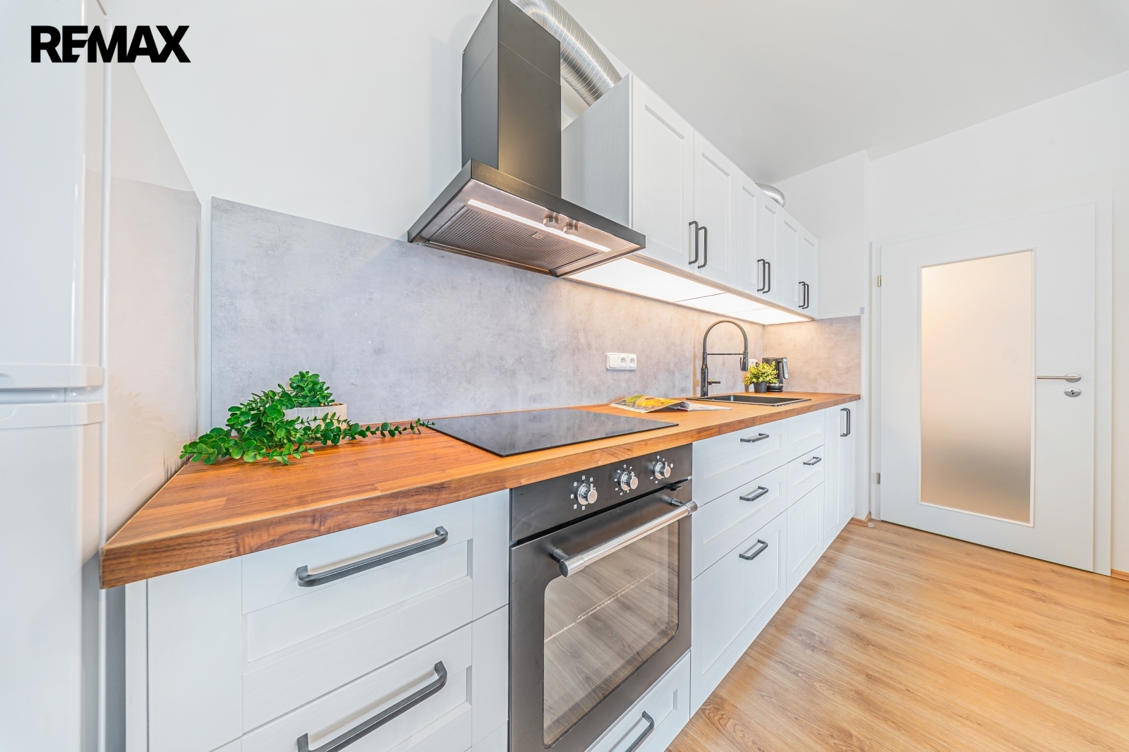 Kuchyňská linka Ikea (možno dále modifikovat) s indukční varnou deskou a externím odvětráním.