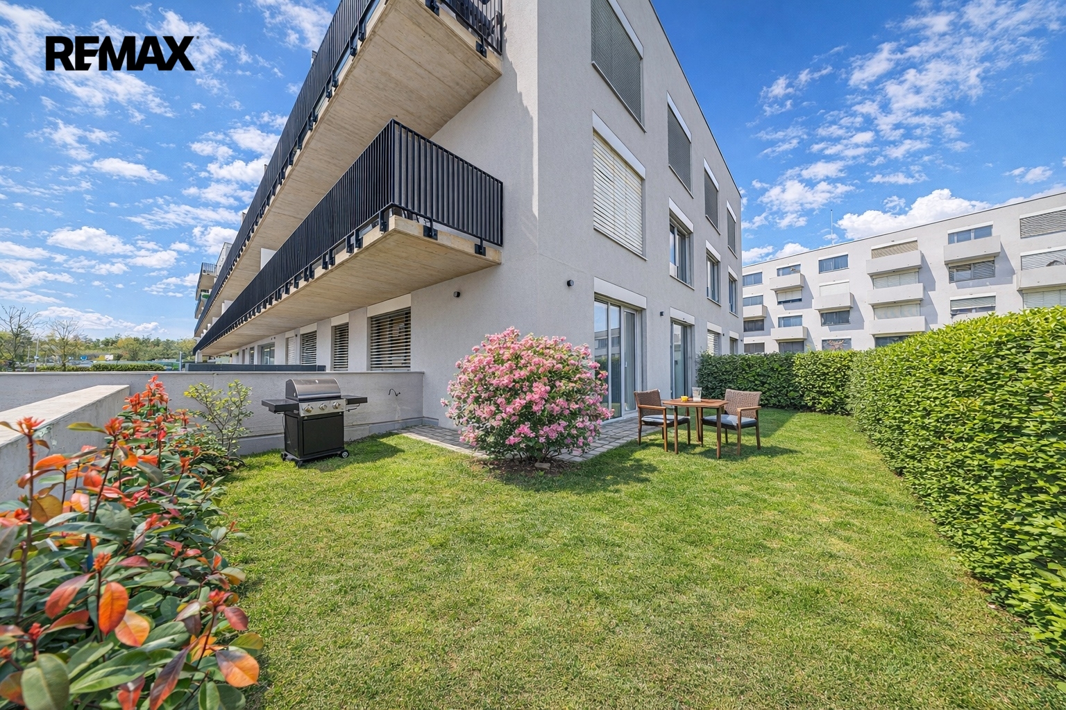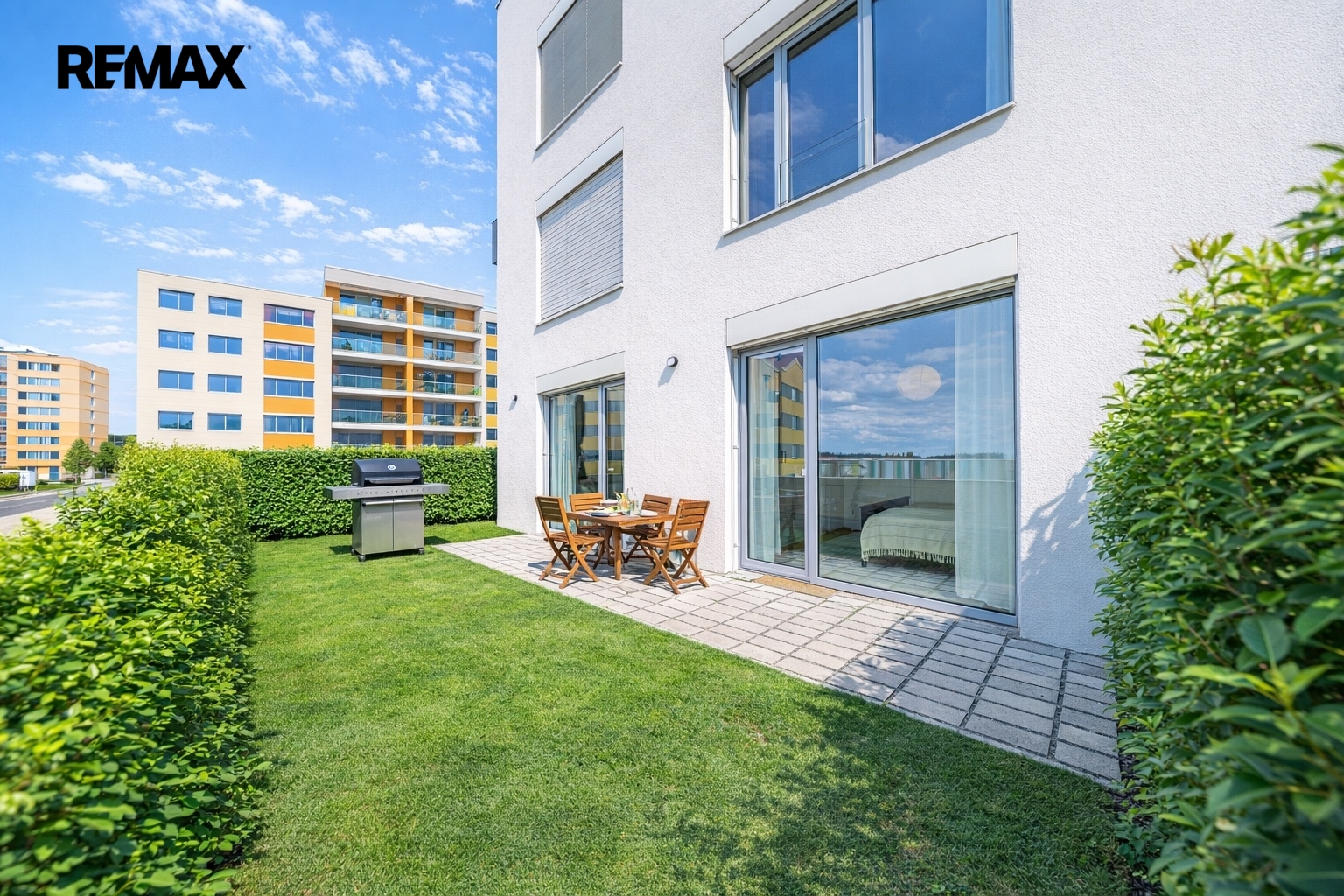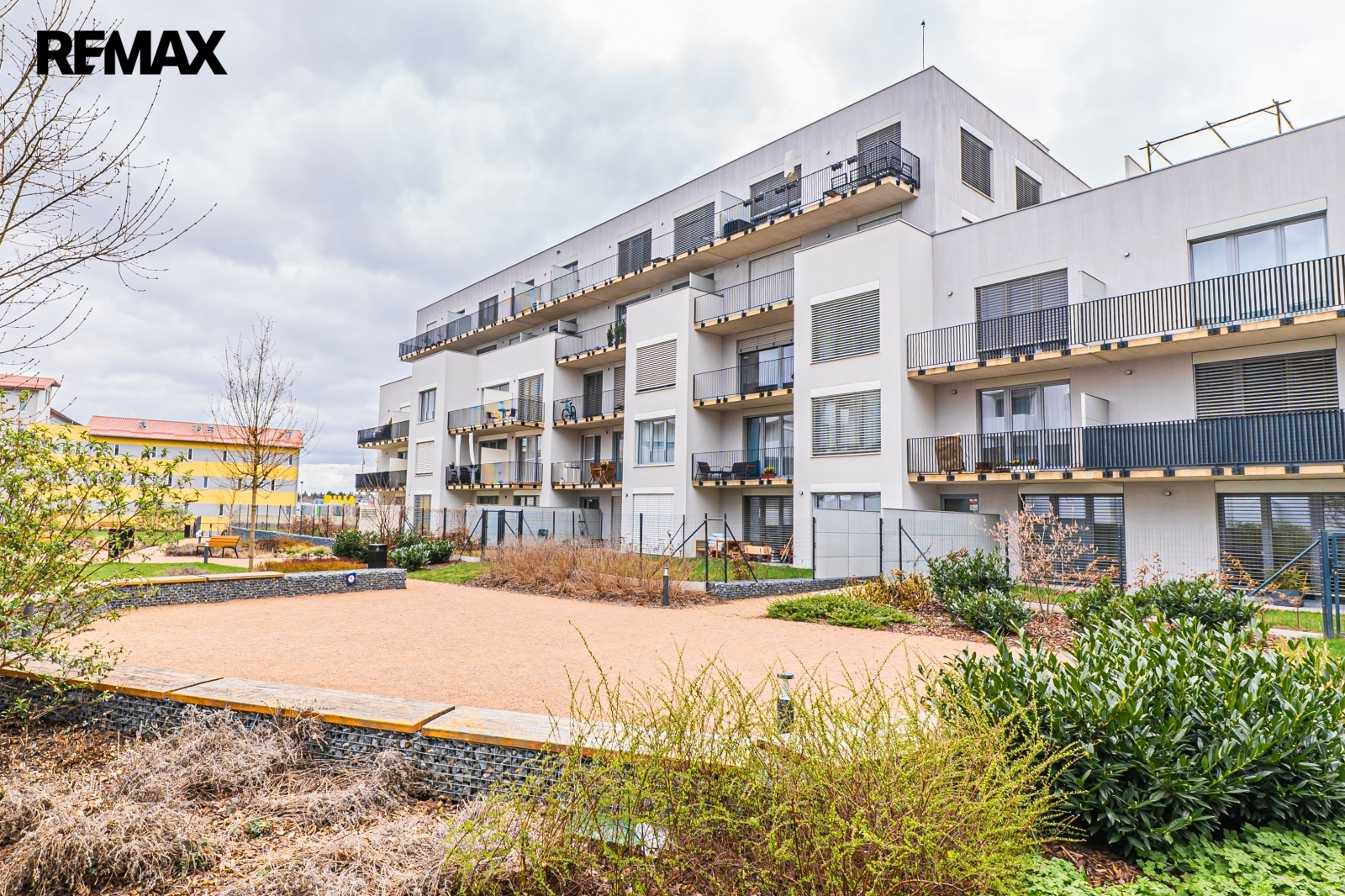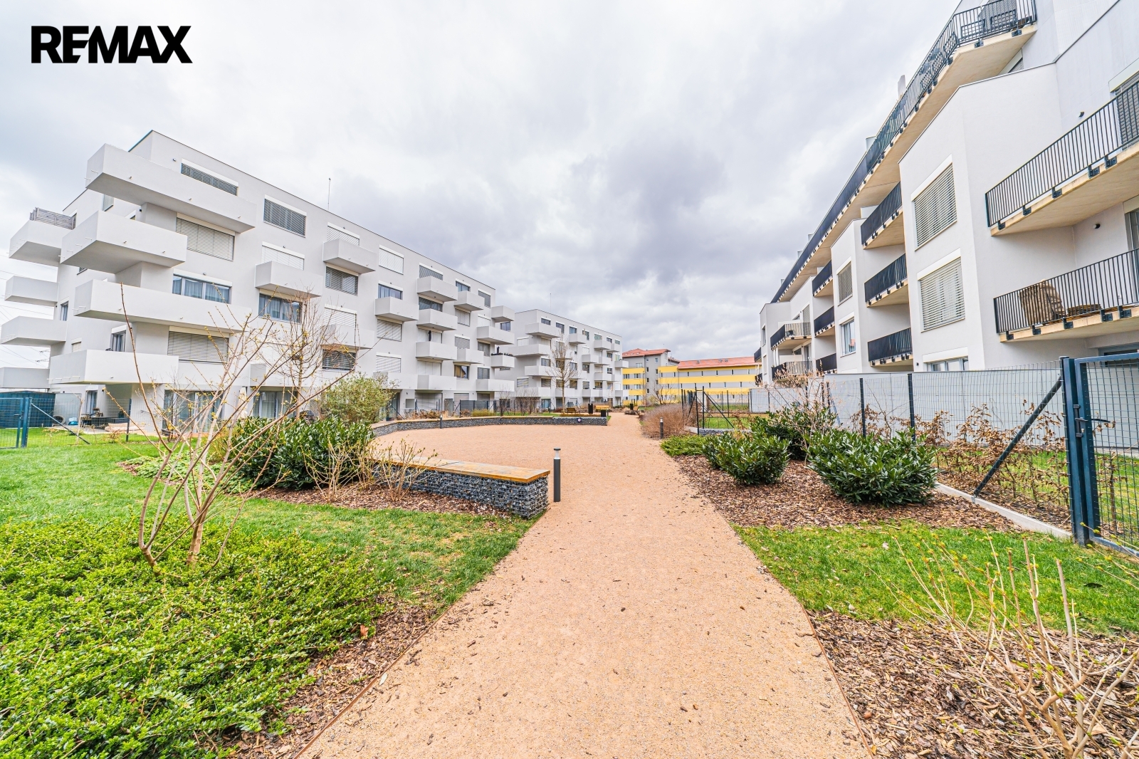 K domu dále náleží uzavřené společné prostranství ve vnitrobloku osazené zelení a lavičkami. Je vhodné k posezení i jako bezpečný prostor pro Vaše děti.