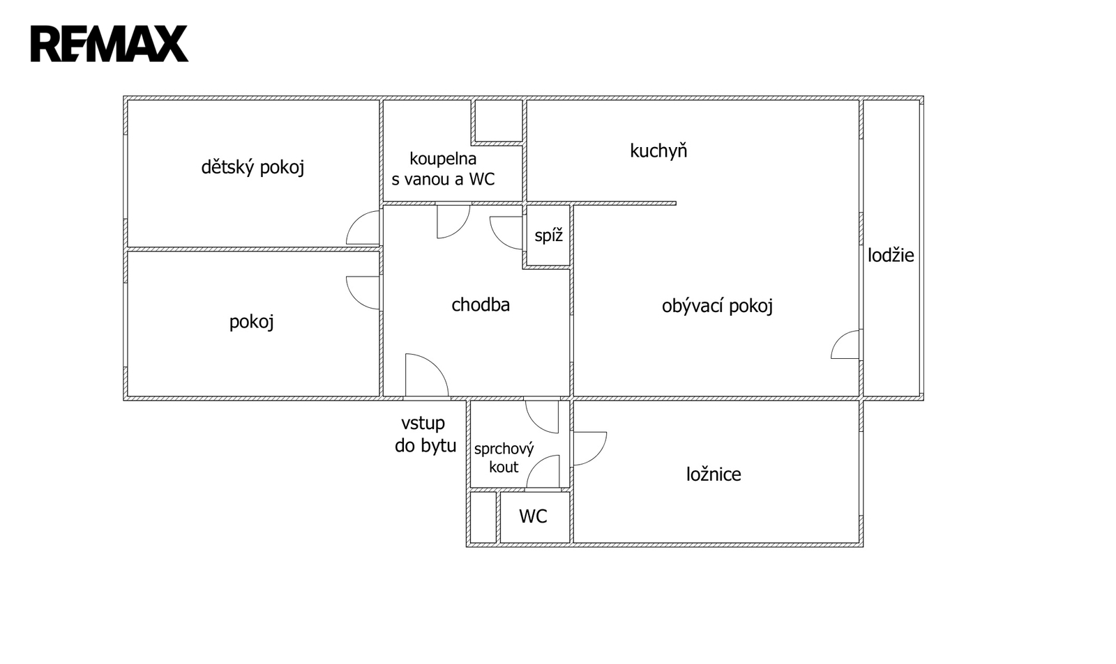 Dispozice bytu: prostorná vstupní chodba, dětský pokoj, pokoj, hlavní koupelna s vanou spojená s WC, spíž, obývací pokoj se vstupem na lodžii s posuvným zasklením, kuchyň, ložnice, druhá koupelna se sprchovým koutem a druhé samostatné WC.