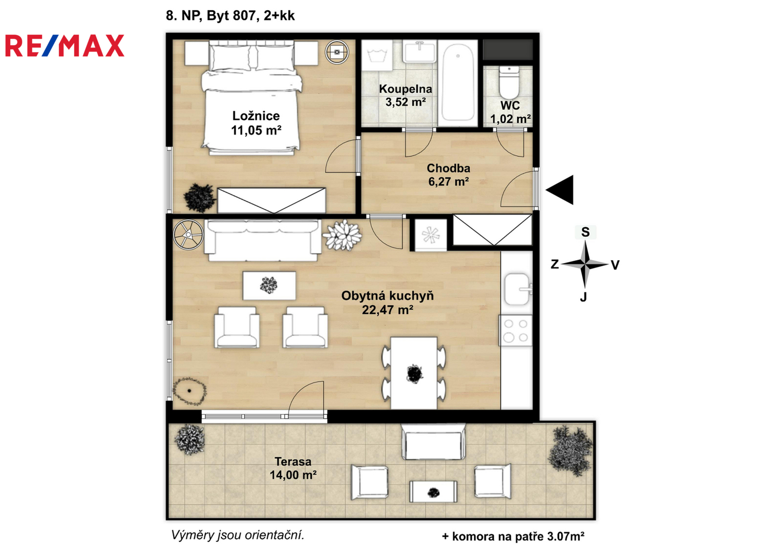 Celková výměra: 63,27 M²: BYT 46,2M² + 3,07 M² KOMORA + 14M² TERASA