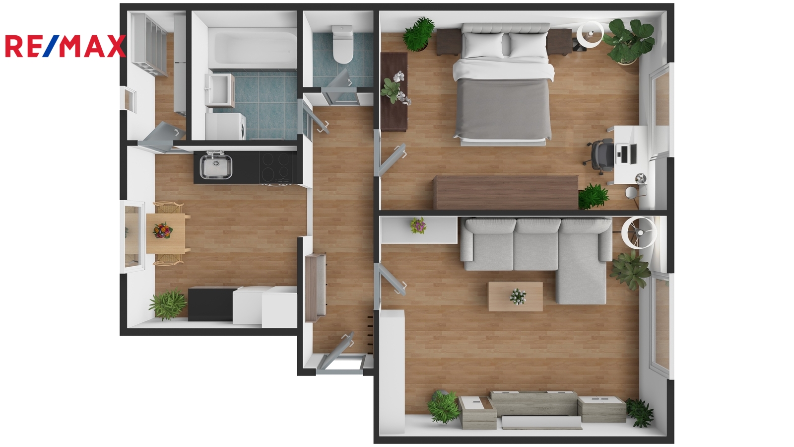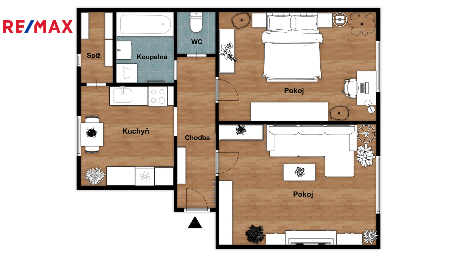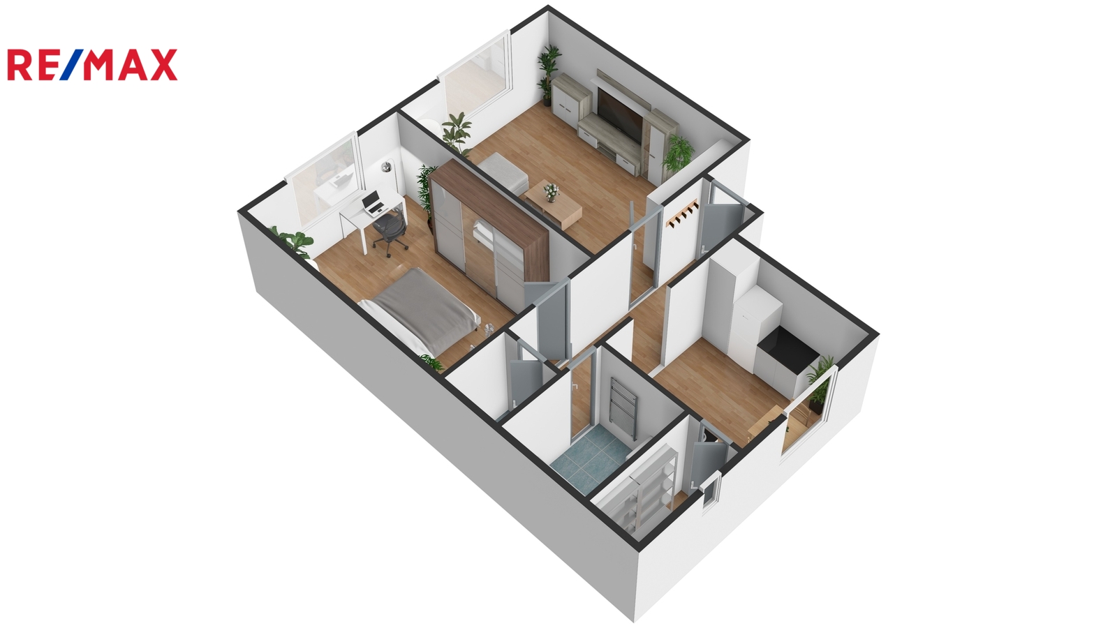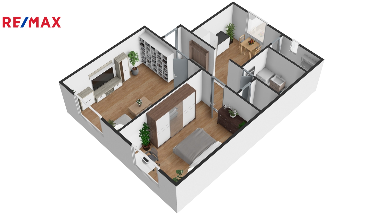Dispozičně je byt výborně řešen a skládá se z prostorné kuchyně s jídelním koutem, obývacího pokoje, ložnice, koupelny a samostatné toalety. Z kuchyně je také přístup do praktické spíže. Příjemným prvkem bytu je vstupní chodba, která všechny místnosti spojuje.
