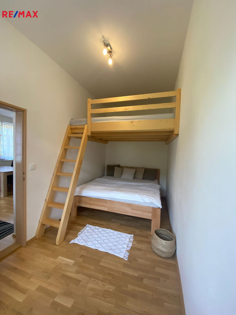 Součástí bytu je nová kuchyňská linka se spotřebiči (lednice zn. ZANUSSI, trouba, sklokeramická deska), patrová postel, stůl, židle, skříně atd., vše je v ceně bytu. Nová koupelna se sprchovým koutem a samostatné WC, el. žebřinové topení, dlažba. Obývací pokoj propojený s kuchyňským koutem, vše útulně a nově zařízeno. Pokoj na spaní má na míru postavenou postel se schody a tím se vytvořilo místo pro dalši spaní dole pod ní – počet míst na spaní až šest 2-2-2. Parkovací stání je před domem na společném pozemku, který je k domu. V domě není žádná místnost na lyže ani sklepy - ve výstavbě.