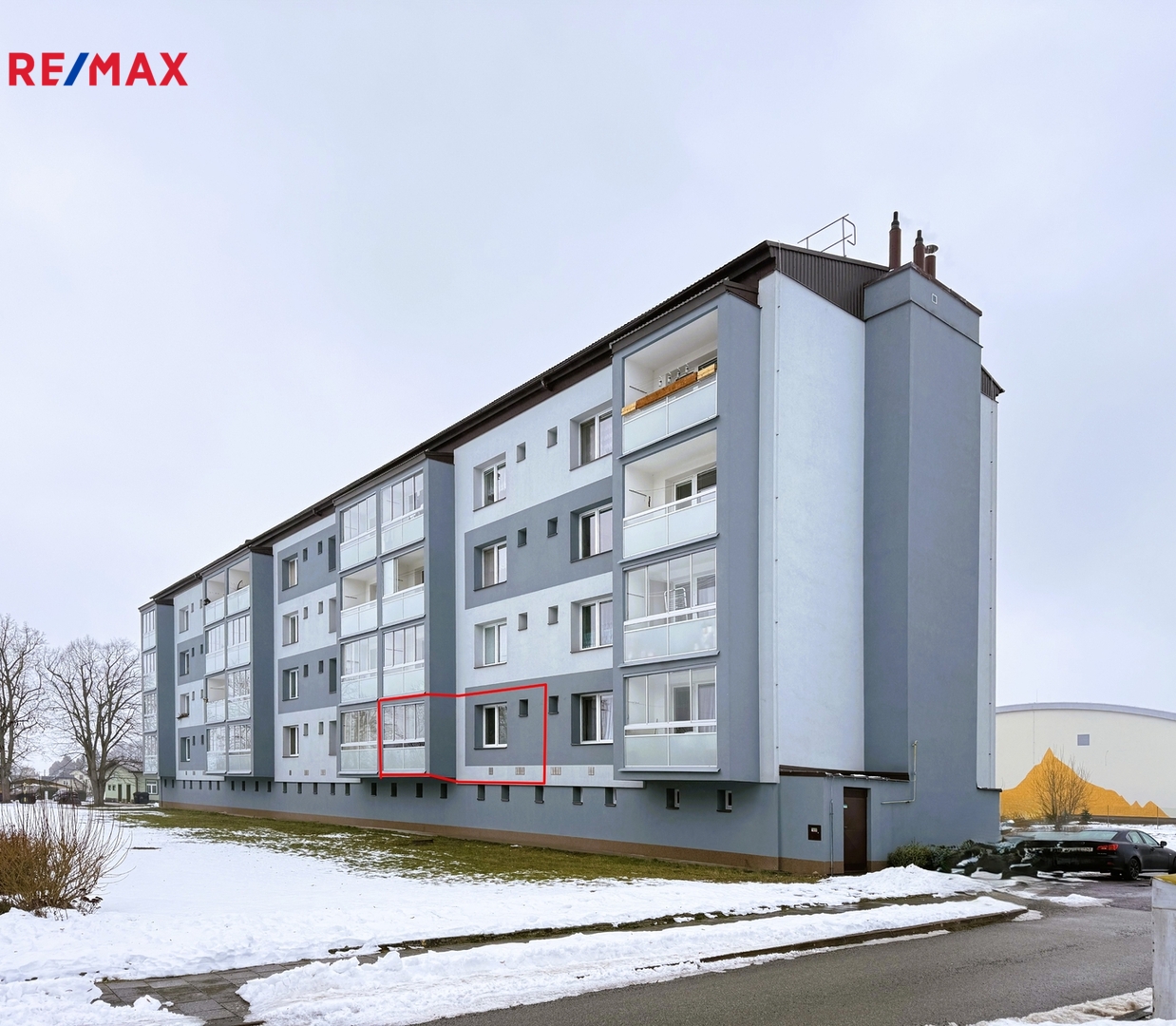 Dům po revitalizaci - nová plastová okna, nová střecha na domě, zateplení budovy, fasáda, zasklené balkony.