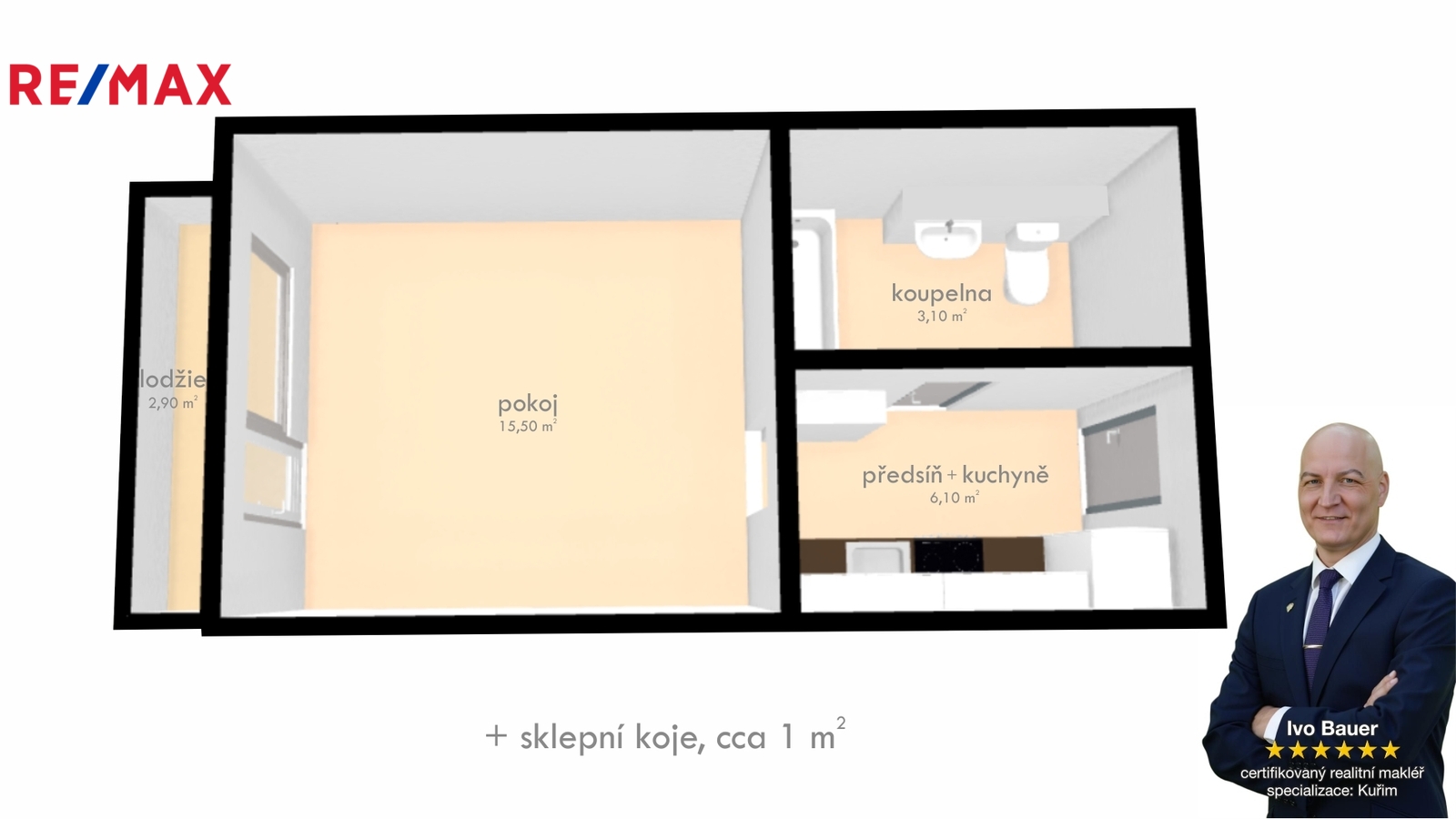 Exkluzivně nabízíme k prodeji byt o dispozici 1+kk s lodžií, který se nachází na ulici Wolkerova v Kuřimi.