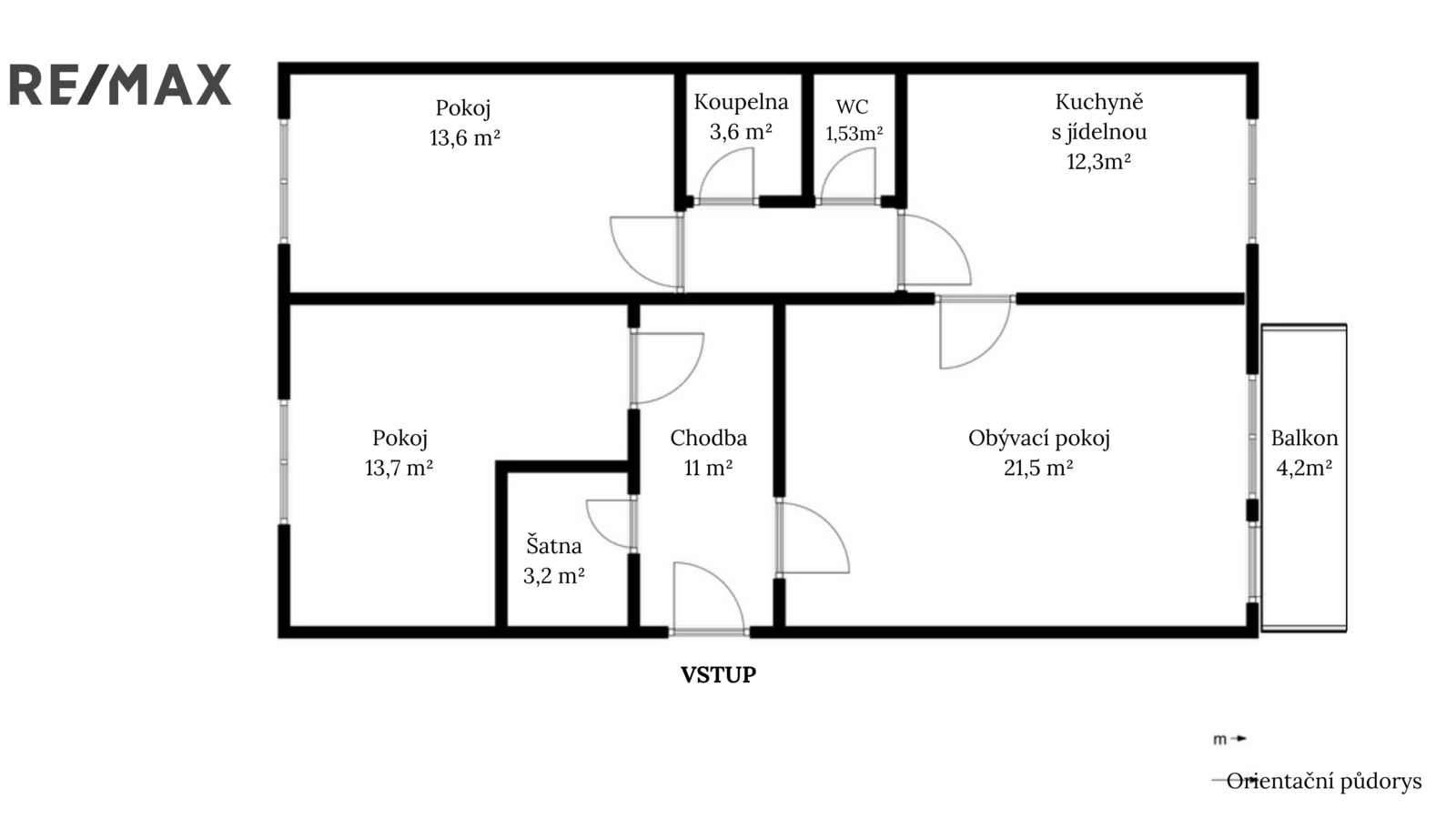 Dispozice bytu nabízí prostorný obývací pokoj o velikosti 21,5 m² se vstupem na balkon o ploše 4,2 m², který je orientovaný na jih stejně jako kuchyň. Kuchyň s jídelním koutem má 12 m², což umožňuje komfortní umístění jídelního stolu. Dále jsou zde dva samostatné pokoje o velikosti 13,5 m² a 13,6 m², praktická šatna o velikosti 3,23 m², prostorná chodba 11 m², koupelna 3,6 m² a samostatné WC o velikosti 1,2 m². V chodbě jsou umístěny vestavěné skříně, které poskytují dostatek úložného prostoru. K bytu náleží také sklepní kóje.