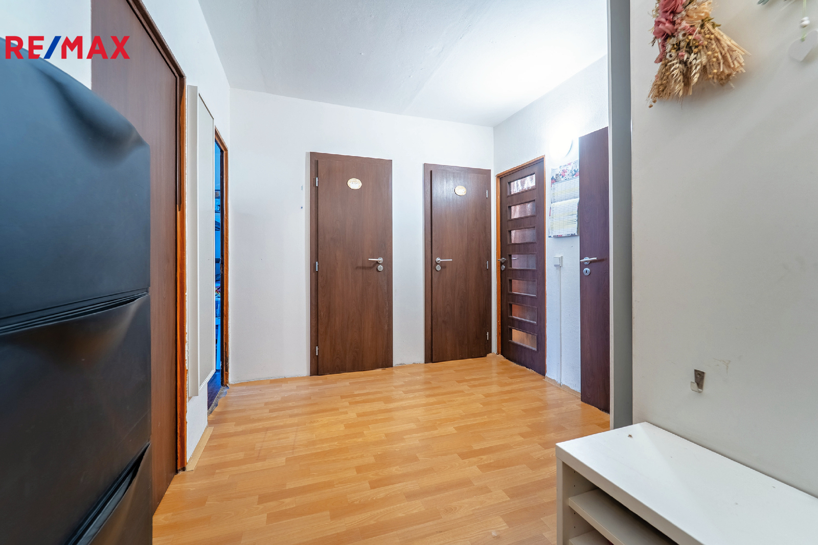 Součástí bytové jednotky je chodba, kde je efektivně využit prostor, zahrnuje šatnu, tři pokoje, samostatnou kuchyň s jídelním koutem, který je nyní využíván, jako pracovna, dále zděné jádro s novou koupelnou, samostatné WC a zasklenou lodžii, která poskytuje ideální místo pro relaxaci a užívání si výhledu do zeleně.