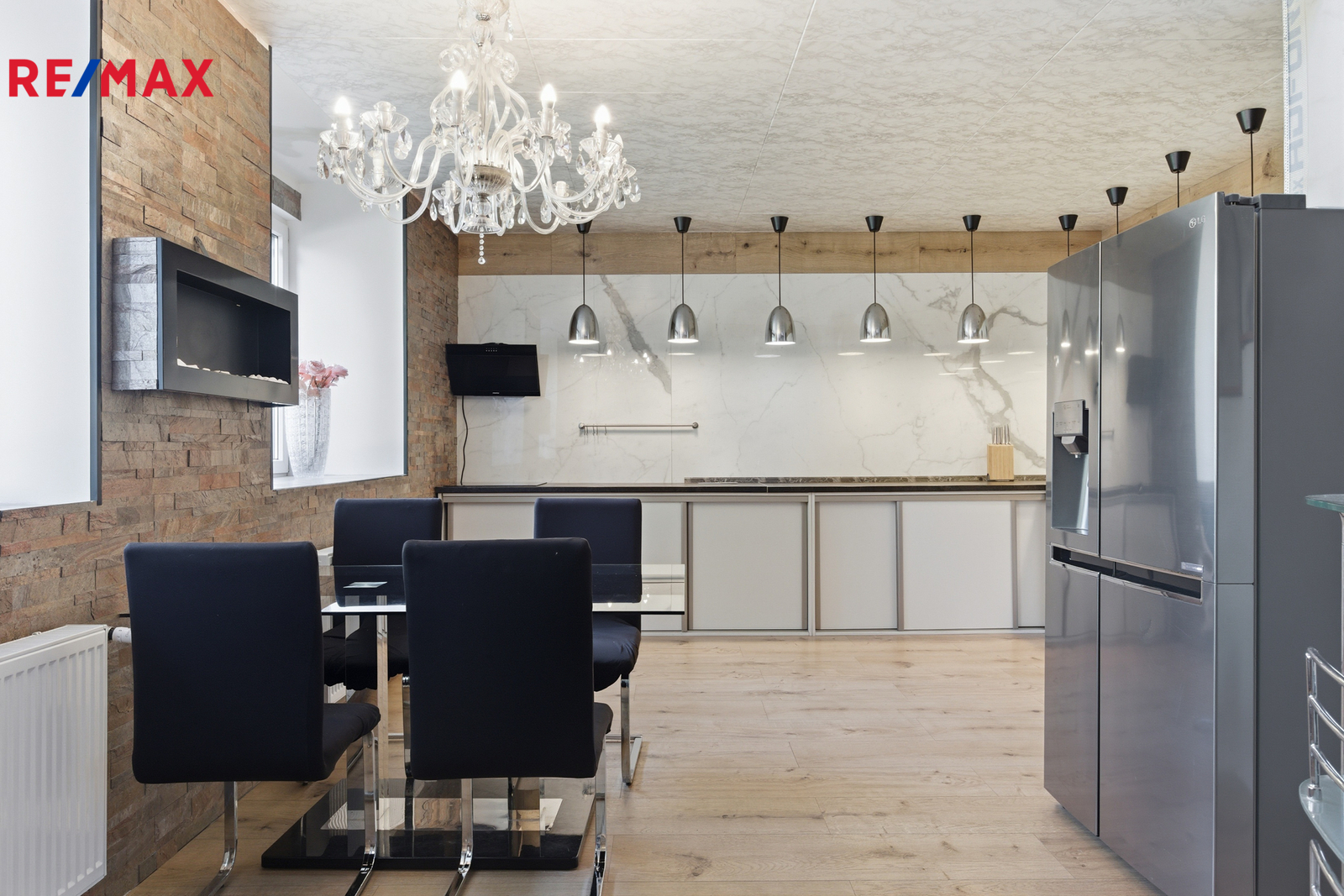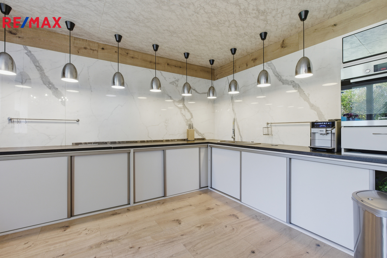 V přízemí hlavní části 4+kk se nachází prostorná kuchyně s jídelnou (35,91 m²), zádveří (3,03 m²), technická místnost s kotelnou (5,89 m²), hobby místnost (19,04 m²), koupelna se sprchovým koutem (4,78 m²) a ateliér (20,91 m²). Kuchyně i přilehlé prostory jsou provedené v moderním stylu s velkoformátovými mramorovými dlažbami o rozměrech 150 × 300 cm (1,5 × 3 m).