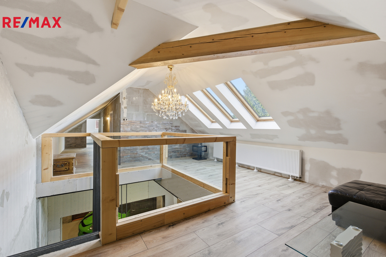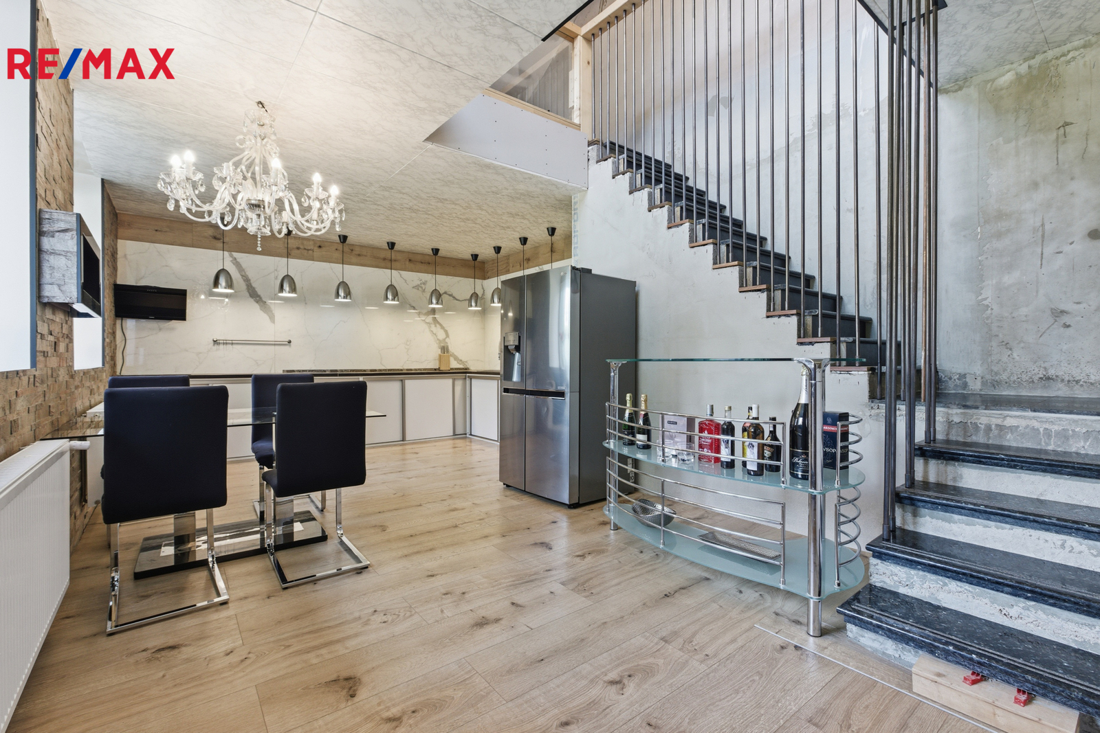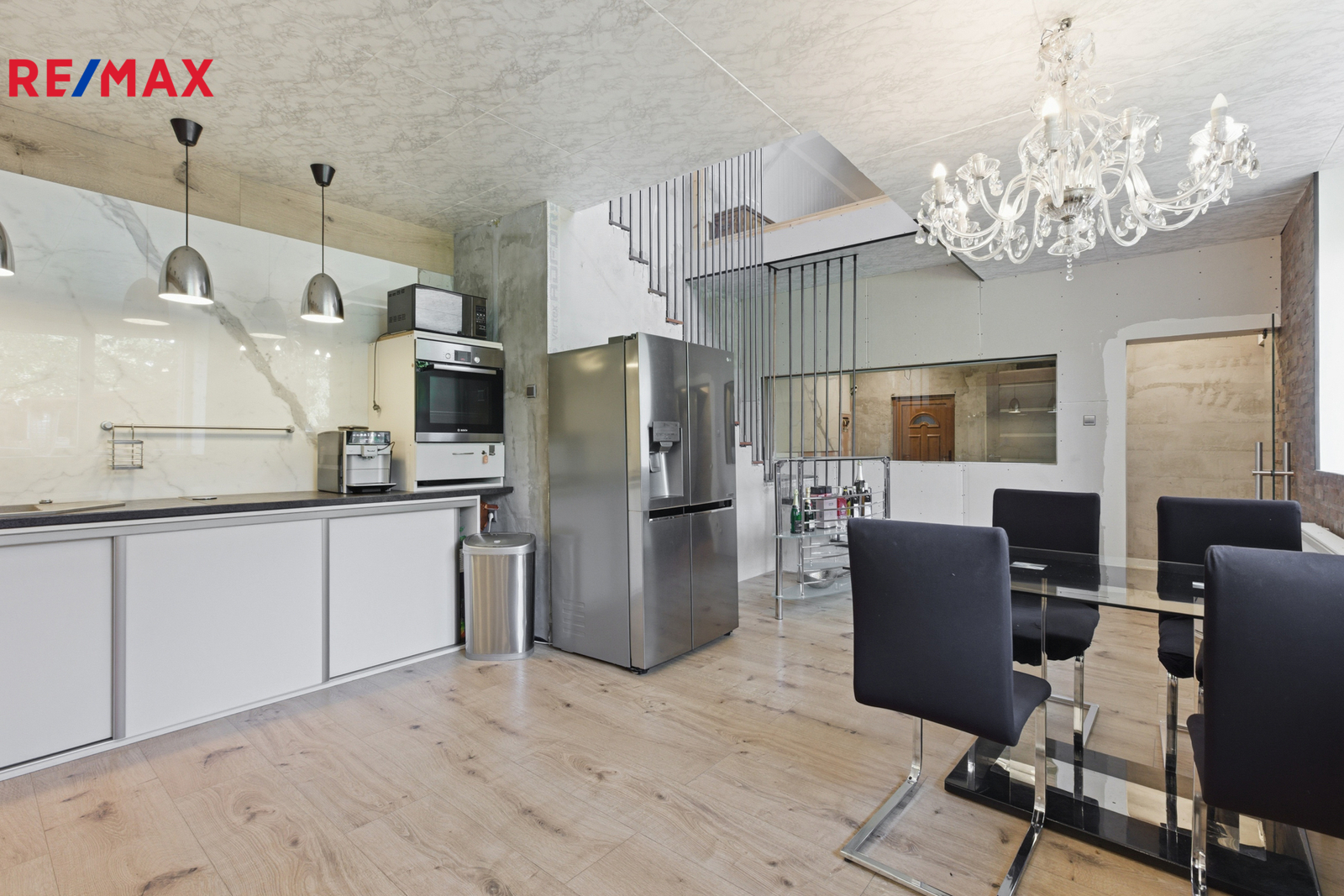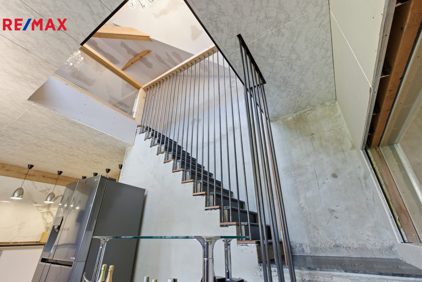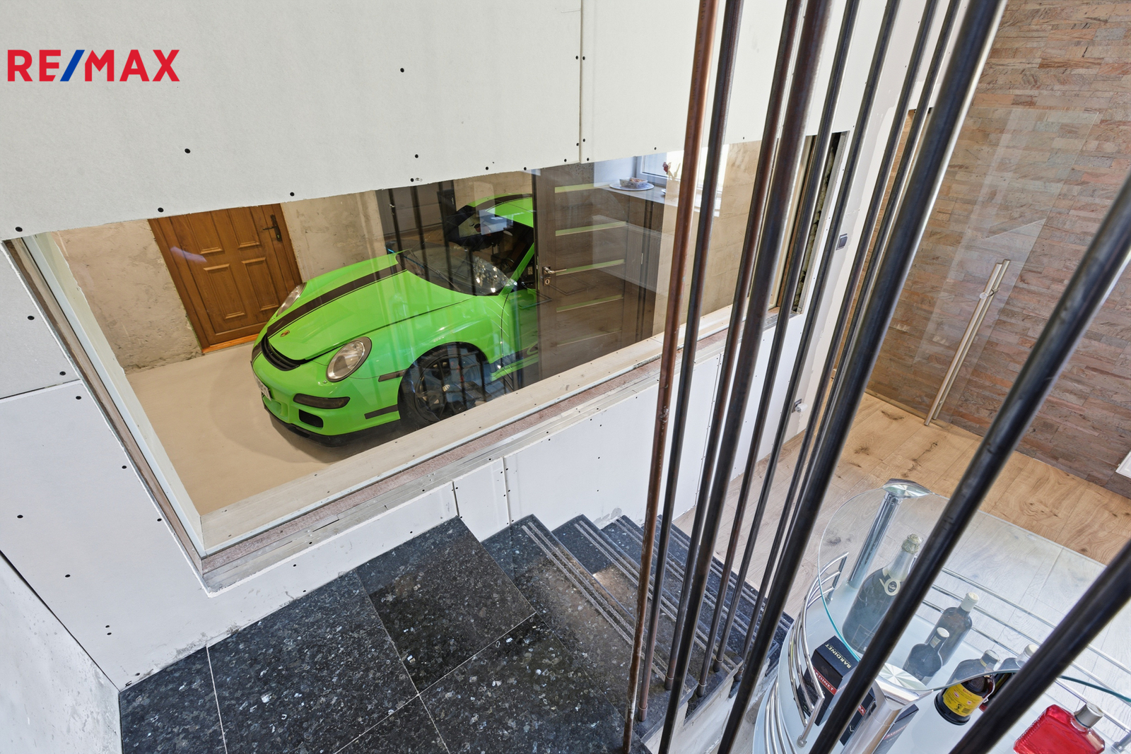 Dominantou přízemí je prosklené atrium, které propojuje obytnou část s hobby místností. Z kuchyně vedou skleněné dveře a okna směrem do této místnosti, díky čemuž je prostor světlý a otevřený. Hobby místnost má elektrická sekční garážová vrata Hörmann, která umožňují přímý přístup a pohodlné parkování. Z atria je vidět na schodiště s elegantním zábradlím se skleněnou výplní, které dodává interiéru vzdušnost a styl.