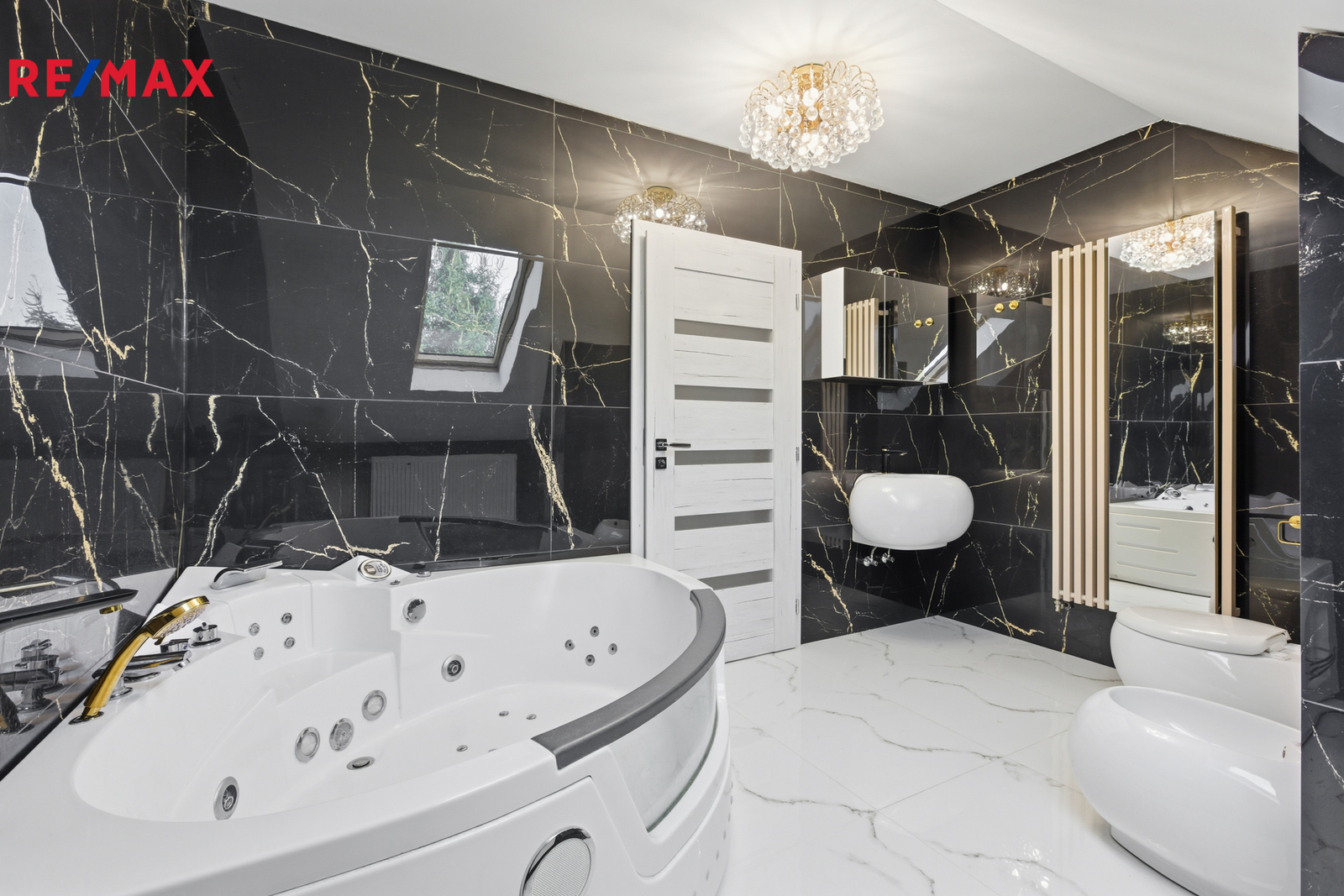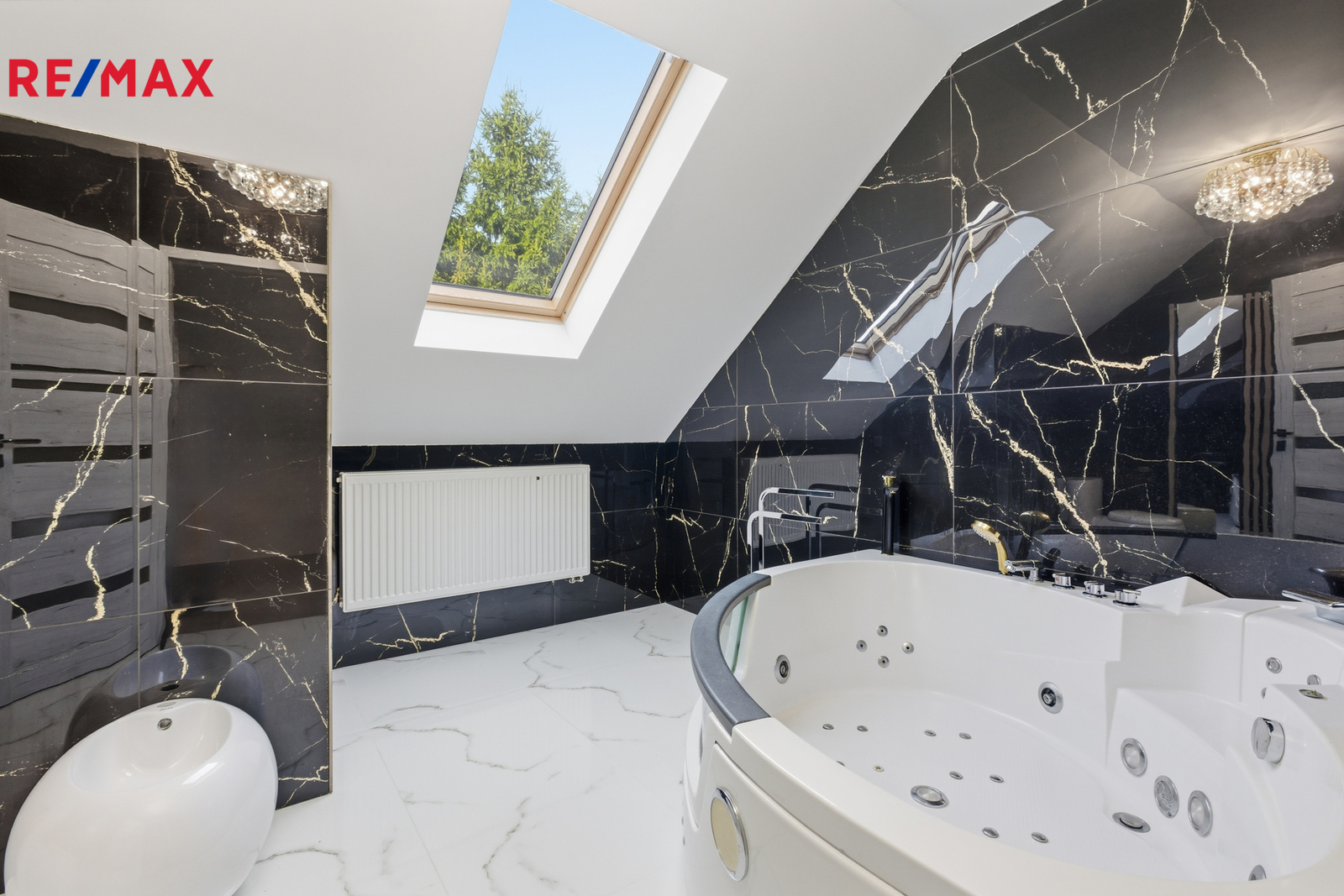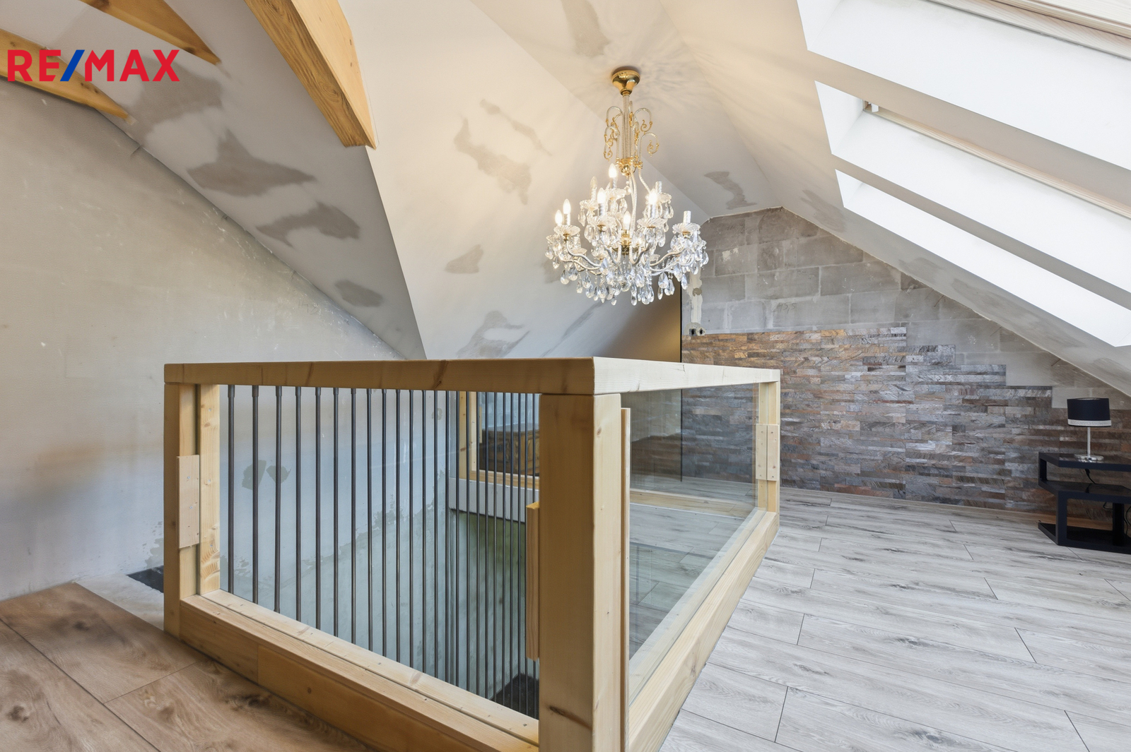 V patře je chodba (15,64 m²), koupelna s vířivou vanou, WC a bidetem (9,88 m²), ložnice (21,06 m²), pokoj (10,62 m²) a galerie (33,25 m²). Schodiště je obloženo pravým mramorem, v koupelnách jsou stejně jako v přízemí velkoformátové dlažby.